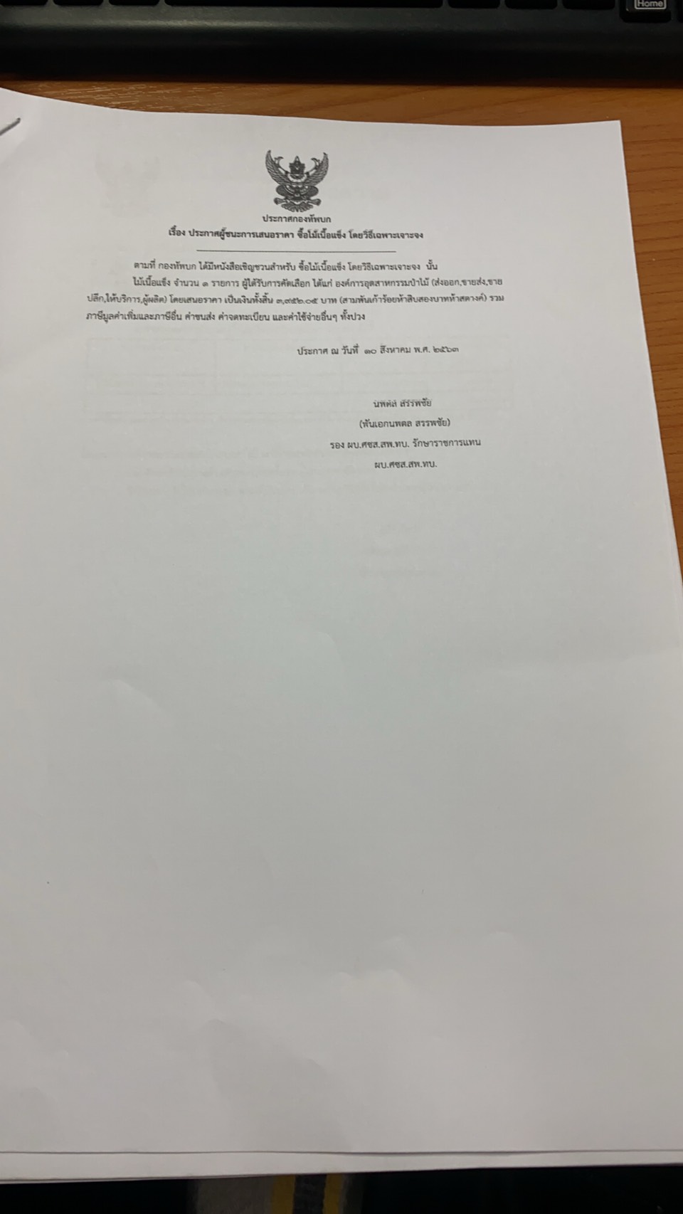 เรื่อง ประกาศผู้ชนะการเสนอราคาซื้อไม้เนื้อแข็ง โดยวิธีเฉพาะเจาะจง