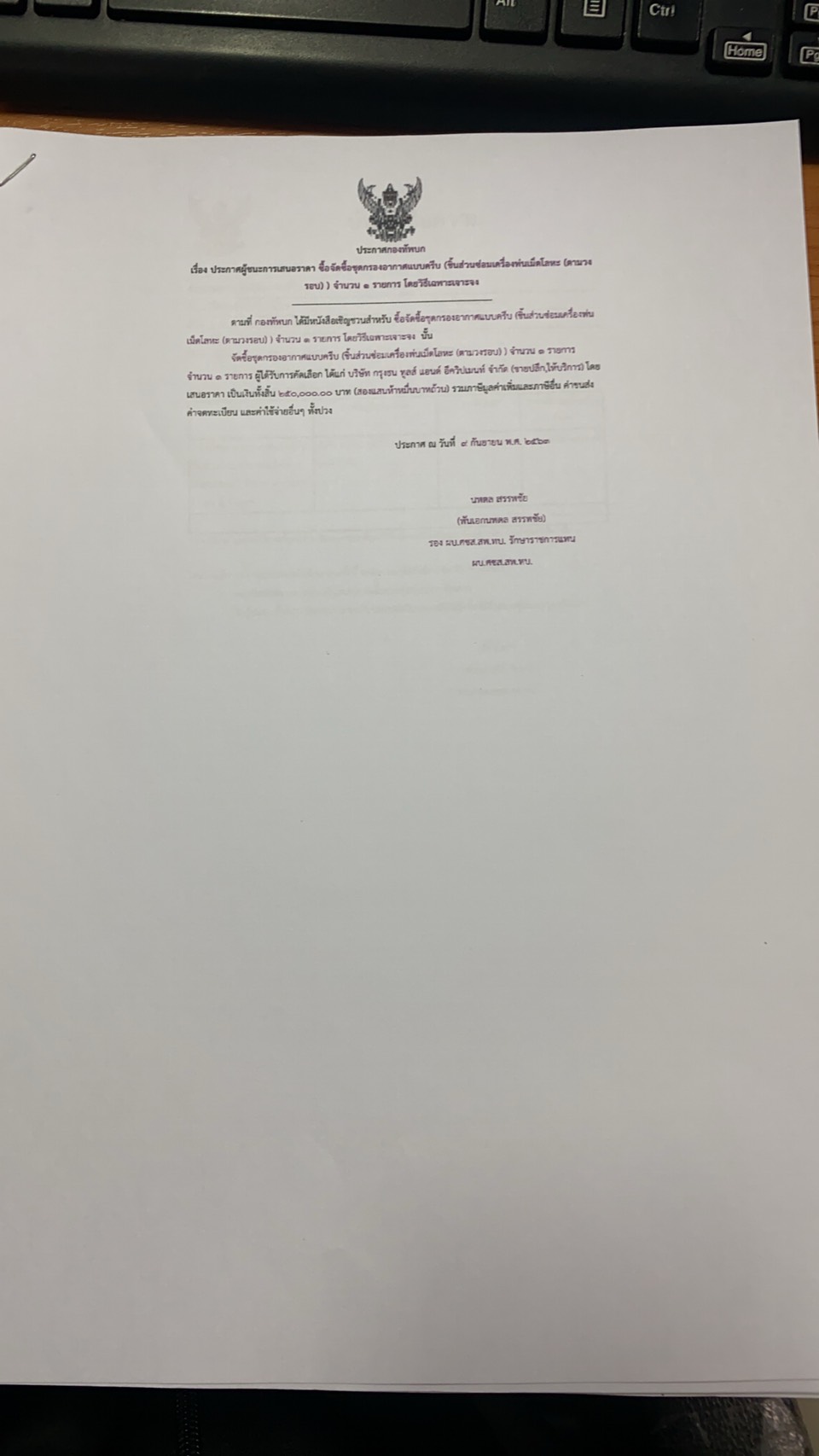 ซื้อชุดกรองอากาศแบบครีบ (ชิ้นส่วนซ่อมเครื่องพ่นเม็ดโลหะ (ตามวงรอบ) ) จำนวน ๑ รายการ ผู้ได้รับการคัดเลือก ได้แก่ บริษัท กรุงธน ทูลส์ แอนด์ อีควิปเมนท์ จำกัด (ขายปลีก,ให้บริการ) โดยเสนอราคา เป็นเงิน ๒๕๐,๐๐๐.- บาท (สองแสนห้าหมื่นบาทถ้วน) รวมภาษีมูลค่าเพิ่มและภาษีอื่น ค่าขนส่ง ค่าจดทะเบียน และค่าใช้จ่ายอื่นๆ ทั้งปวง