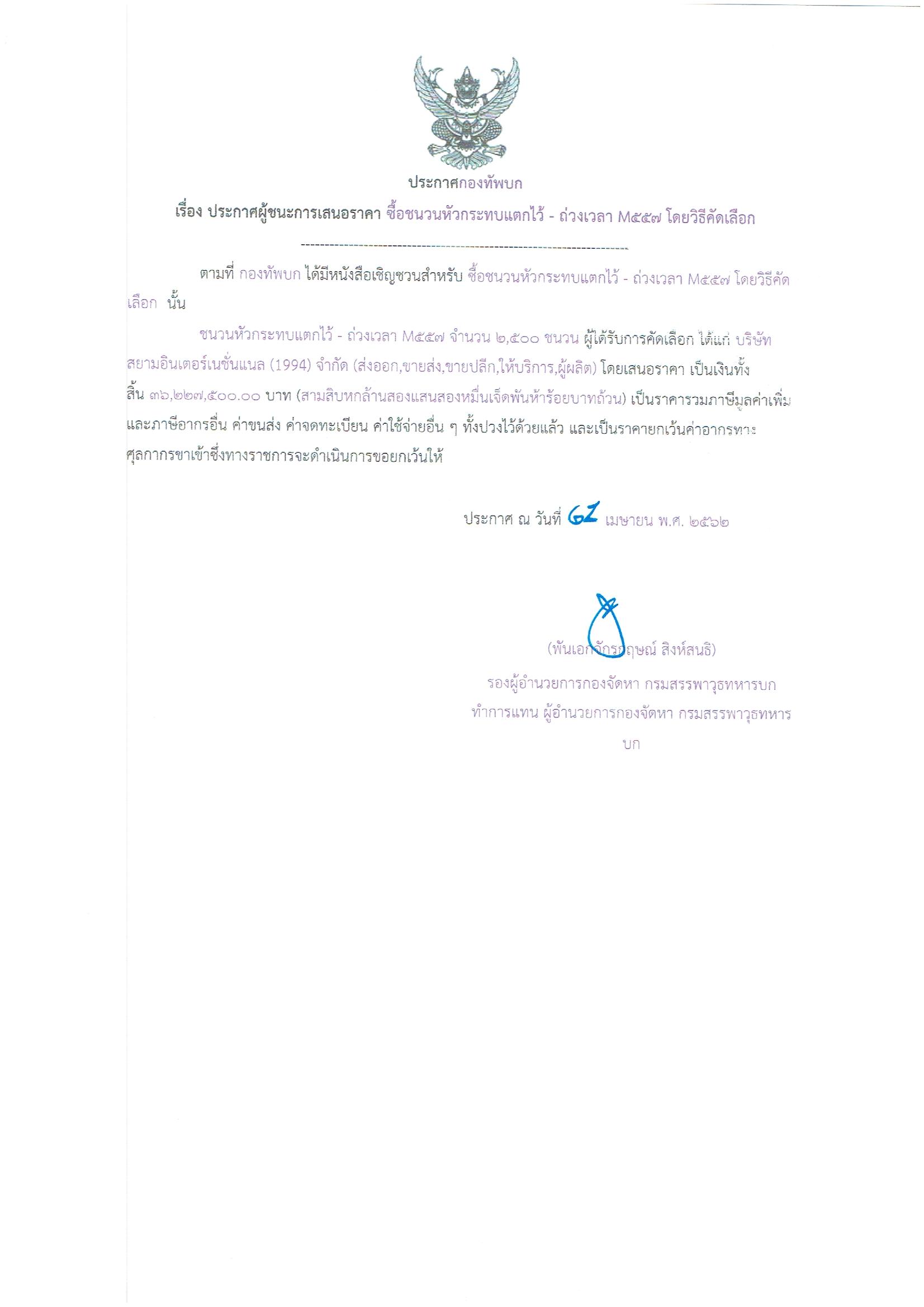 ชนวนหัวกระทบแตกไว้ - ถ่วงเวลา M๕๕๗ จำนวน ๒,๕๐๐ ชนวน ผู้ได้รับการคัดเลือก ได้แก่ บริษัท สยามอินเตอร์เนชั่นแนล (1994) จำกัด (ส่งออก,ขายส่ง,ขายปลีก,ให้บริการ,ผู้ผลิต) โดยเสนอราคา เป็นเงินทั้งสิ้น ๓๖,๒๒๗,๕๐๐.๐๐ บาท (สามสิบหกล้านสองแสนสองหมื่นเจ็ดพันห้าร้อยบาทถ้วน) เป็นราคารวมภาษีมูลค่าเพิ่ม และภาษีอากรอื่น ค่าขนส่ง ค่าจดทะเบียน ค่าใช้จ่ายอื่น ๆ ทั้งปวงไว้ด้วยแล้ว และเป็นราคายกเว้นค่าอากรทางศุลกากรขาเข้าซึ่งทางราชการจะดำเนินการขอยกเว้นให้
