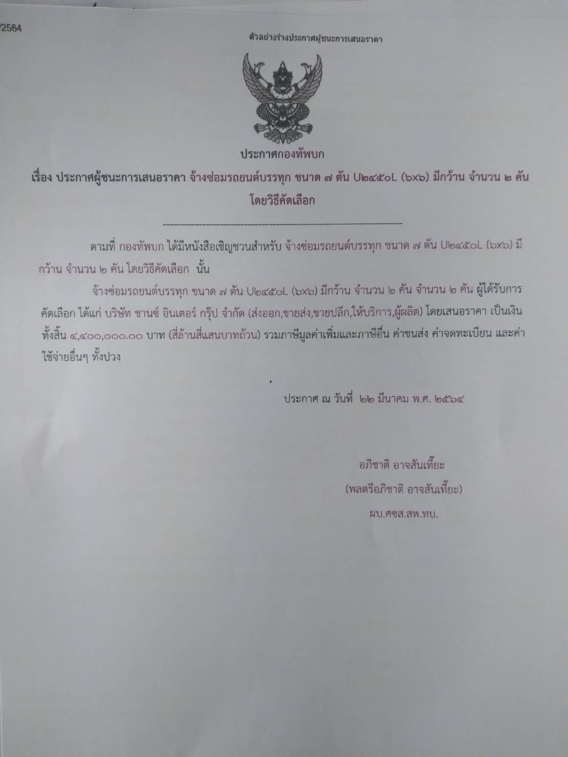การจ้างซ่อม รถยนต์บรรทุก ขนาด ๗ ตัน U2450L (6x6) มีกว้าน จำนวน ๒ คัน ผู้ได้รับการคัดเลือก ได้แก่ บริษัท ชานซ์ อินเตอร์ กรุ๊ป จำกัด โดยเสนอราคา เป็นเงินทั้งสิ้น ๔,๔๐๐,๐๐๐.- บาท (สี่ล้านสี่แสนบาทถ้วน) รวมภาษีมูลค่าเพิ่มและภาษีอื่น ค่าขนส่ง ค่าจดทะเบียน และค่าใช้จ่ายอื่นๆ ทั้งปวง