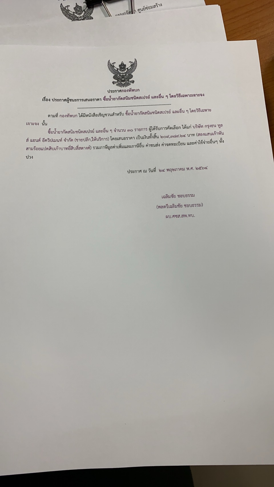 ตามที่ กองทัพบก ได้มีหนังสือเชิญชวนสำหรับ ซื้อน้ำยากัดสนิมชนิดสเปรย์ และอื่น ๆ โดยวิธีเฉพาะเจาะจง นั้น