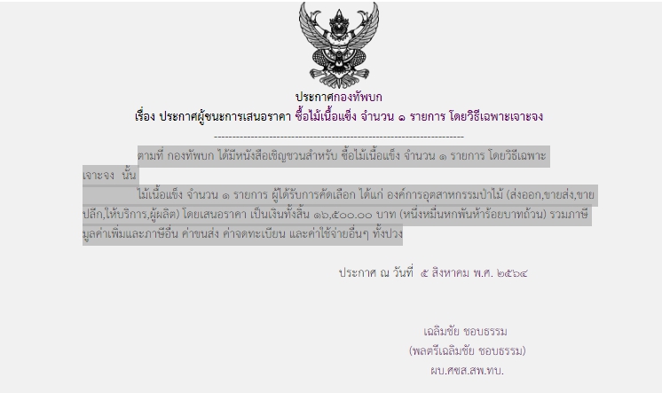 ตามที่ กองทัพบก ได้มีหนังสือเชิญชวนสำหรับ ซื้อไม้เนื้อแข็ง จำนวน ๑ รายการ โดยวิธีเฉพาะเจาะจง นั้น
