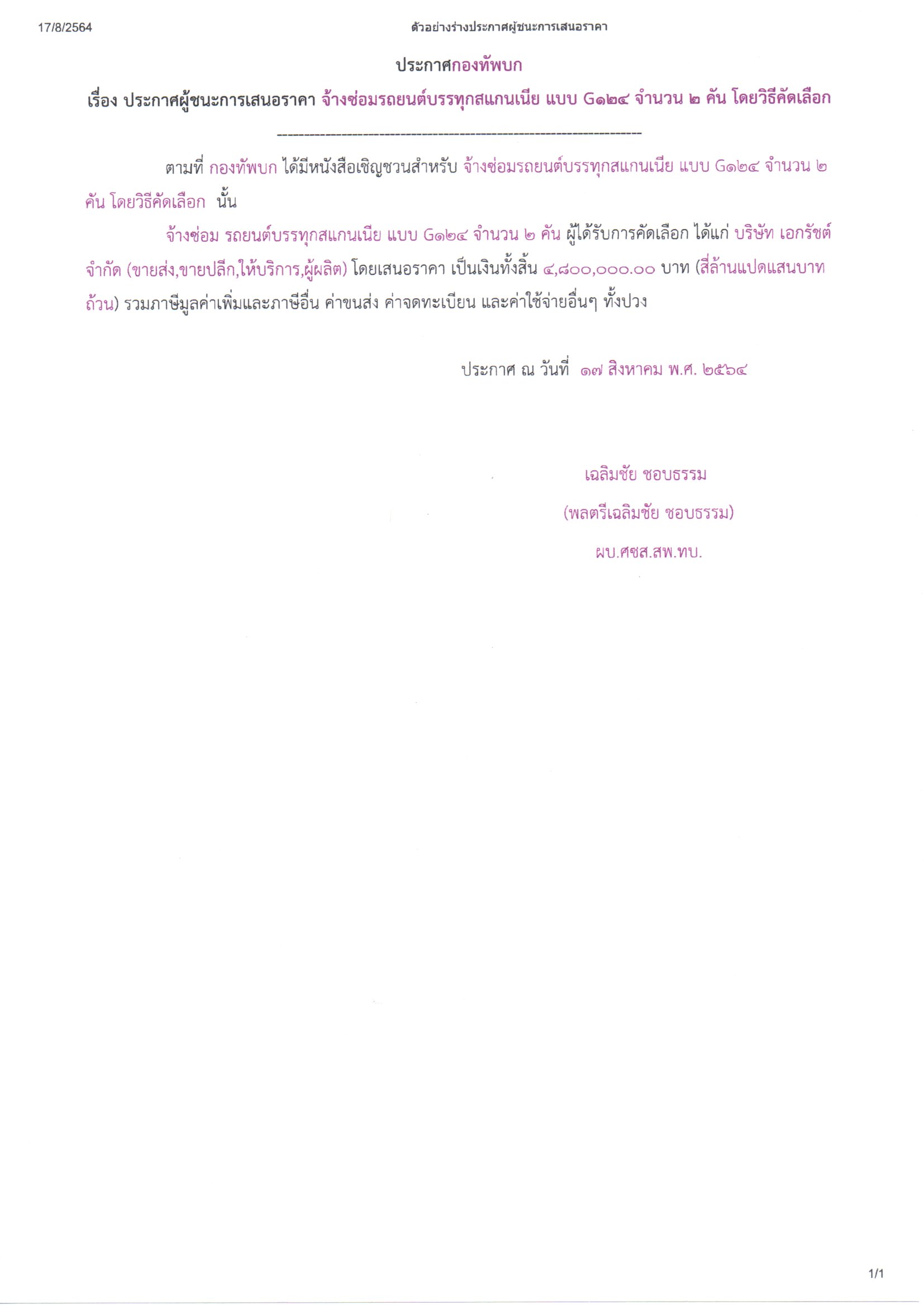 ตามที่ กองทัพบก ได้มีหนังสือเชิญชวนสำหรับ จ้างซ่อม รถยนต์บรรทุกสแกนเนีย แบบ G124 จำนวน ๒ คันโดยวิธีคัดเลือก นั้น