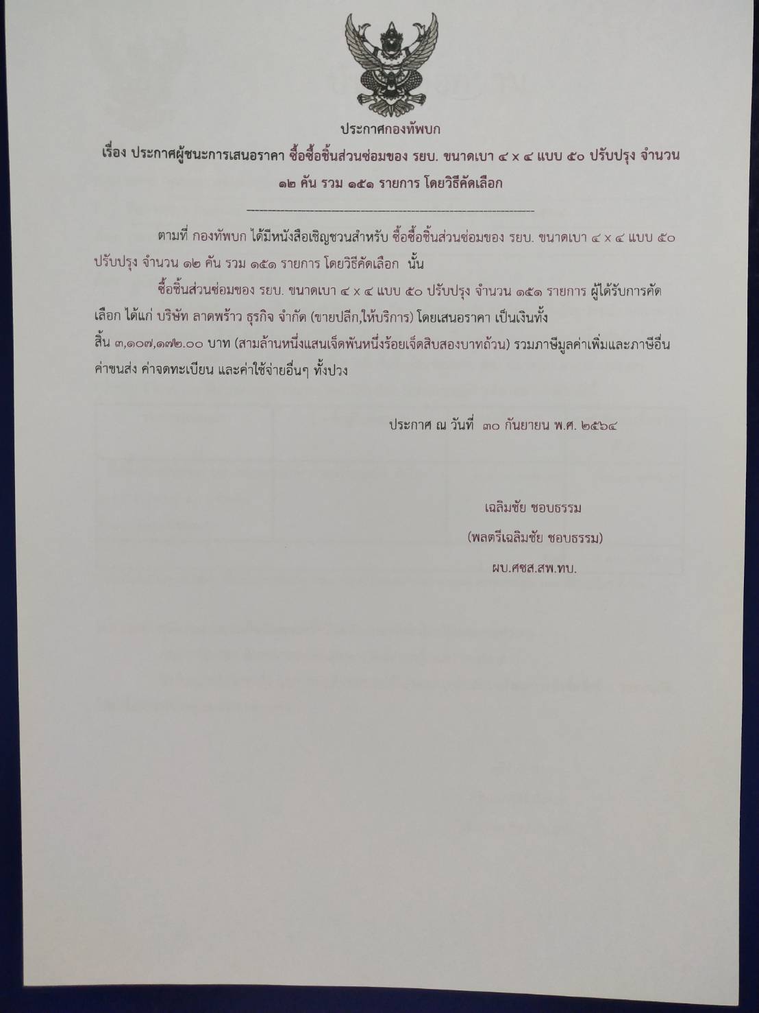เรื่อง ประกาศผู้ชนะการเสนอราคา จัดซื้อชิ้นส่วนซ่อมของ รยบ. ขนาดเบา ๔ x ๔ แบบ ๕๐ ปรับปรุง จำนวน ๑๕๑ รายการ