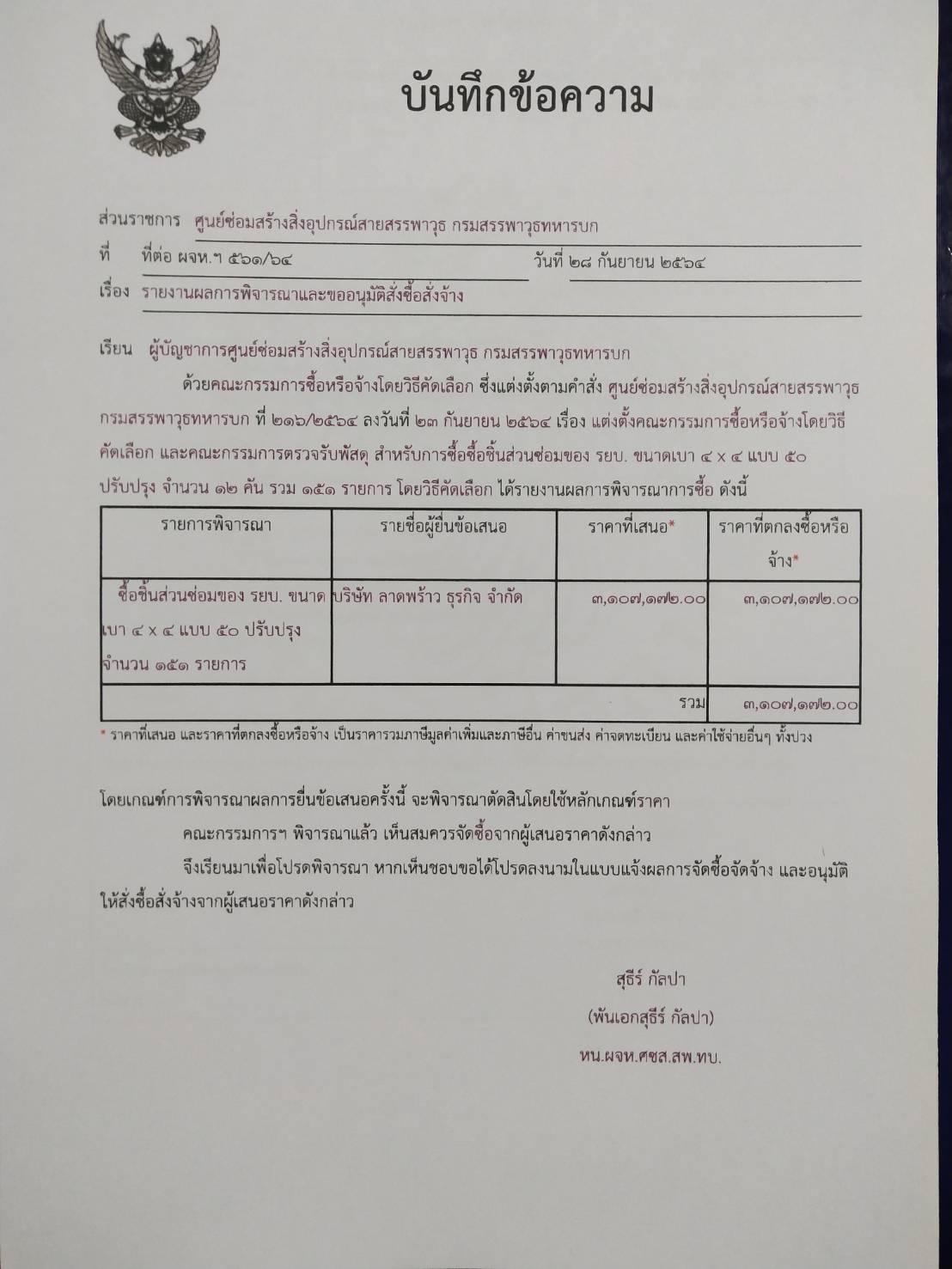 ซื้อชิ้นส่วนซ่อมของ รยบ. ขนาดเบา ๔ x ๔ แบบ ๕๐ ปรับปรุง จำนวน ๑๕๑ รายการ ผู้ได้รับการคัดเลือก ได้แก่ บริษัท ลาดพร้าว ธุรกิจ จำกัด (ขายปลีก,ให้บริการ) โดยเสนอราคา เป็นเงินทั้งสิ้น ๓,๑๐๗,๑๗๒.๐๐ บาท (สามล้านหนึ่งแสนเจ็ดพันหนึ่งร้อยเจ็ดสิบสองบาทถ้วน) รวมภาษีมูลค่าเพิ่มและภาษีอื่น ค่าขนส่ง ค่าจดทะเบียน และค่าใช้จ่ายอื่นๆ ทั้งปวง