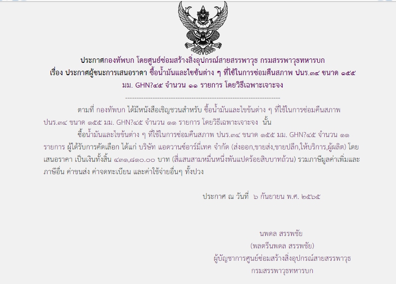 ตามที่ กองทัพบก โดยศูนย์ซ่อมสร้างสิ่งอุปกรณ์สายสรรพาวุธ กรมสรรพาวุธทหารบก ได้มีโครงการ ซื้อน้ำมันและไขข้นต่าง ๆ ที่ใช้ในการซ่อมคืนสภาพ ปนร.๓๔ ขนาด ๑๕๕ มม. GHN–45 จำนวน ๑๑ รายการ โดยวิธีเฉพาะเจาะจง นั้น