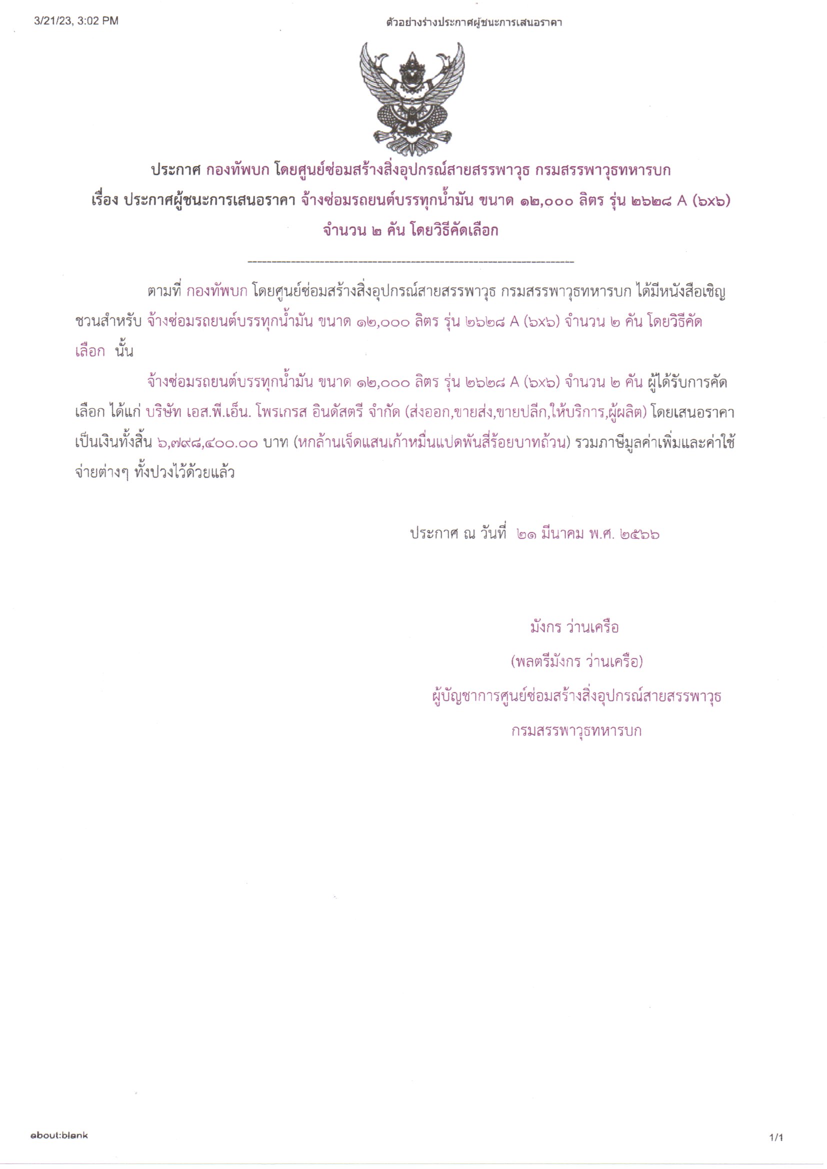 เรื่อง ประกาศผู้ชนะเสนอราคา การจ้างซ่อมรถยนต์บรรทุกน้ำมัน ขนาด ๑๒,๐๐๐ ลิตร รุ่น ๒๖๒๘ A (๖x๖) จำนวน ๒ คัน โดยวิธีคัดเลือก
