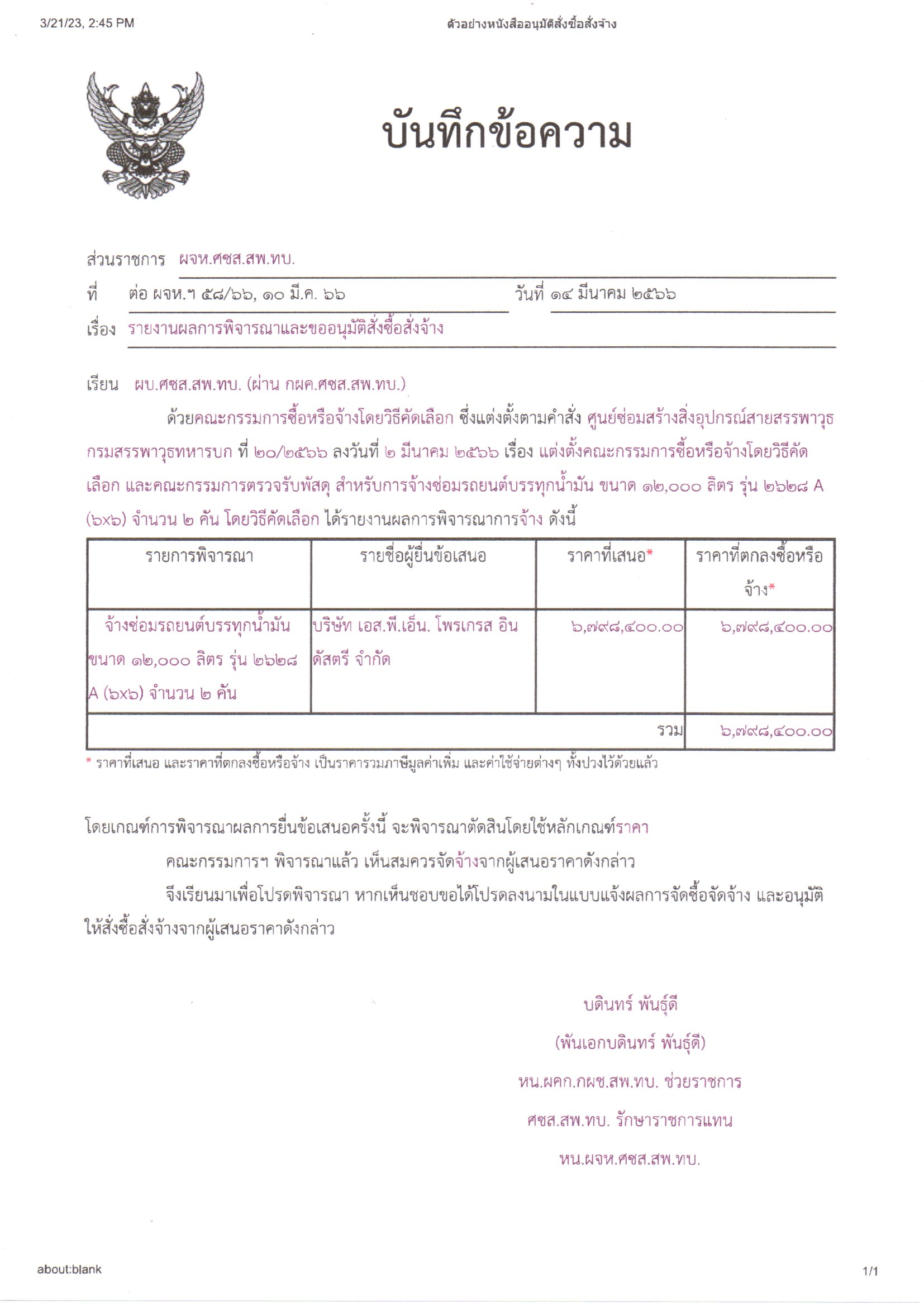 การจ้างซ่อมรถยนต์บรรทุกน้ำมัน ขนาด ๑๒,๐๐๐ ลิตร รุ่น ๒๖๒๘ A (๖x๖) จำนวน ๒ คัน ผู้ได้รับการคัดเลือก ได้แก่ บริษัท เอส.พี.เอ็น. โพรเกรส อินดัสตรี จำกัด (ส่งออก,ขายส่ง,ขายปลีก,ให้บริการ,ผู้ผลิต) โดยเสนอราคาเป็นเงินทั้งสิ้น ๖,๗๙๘,๔๐๐.๐๐ บาท (หกล้านเจ็ดแสนเก้าหมื่นแปดพันสี่ร้อยบาทถ้วน) รวมภาษีมูลค่าเพิ่มและค่าใช้จ่ายต่าง ๆ ทั้งปวงไว้ด้วยแล้ว