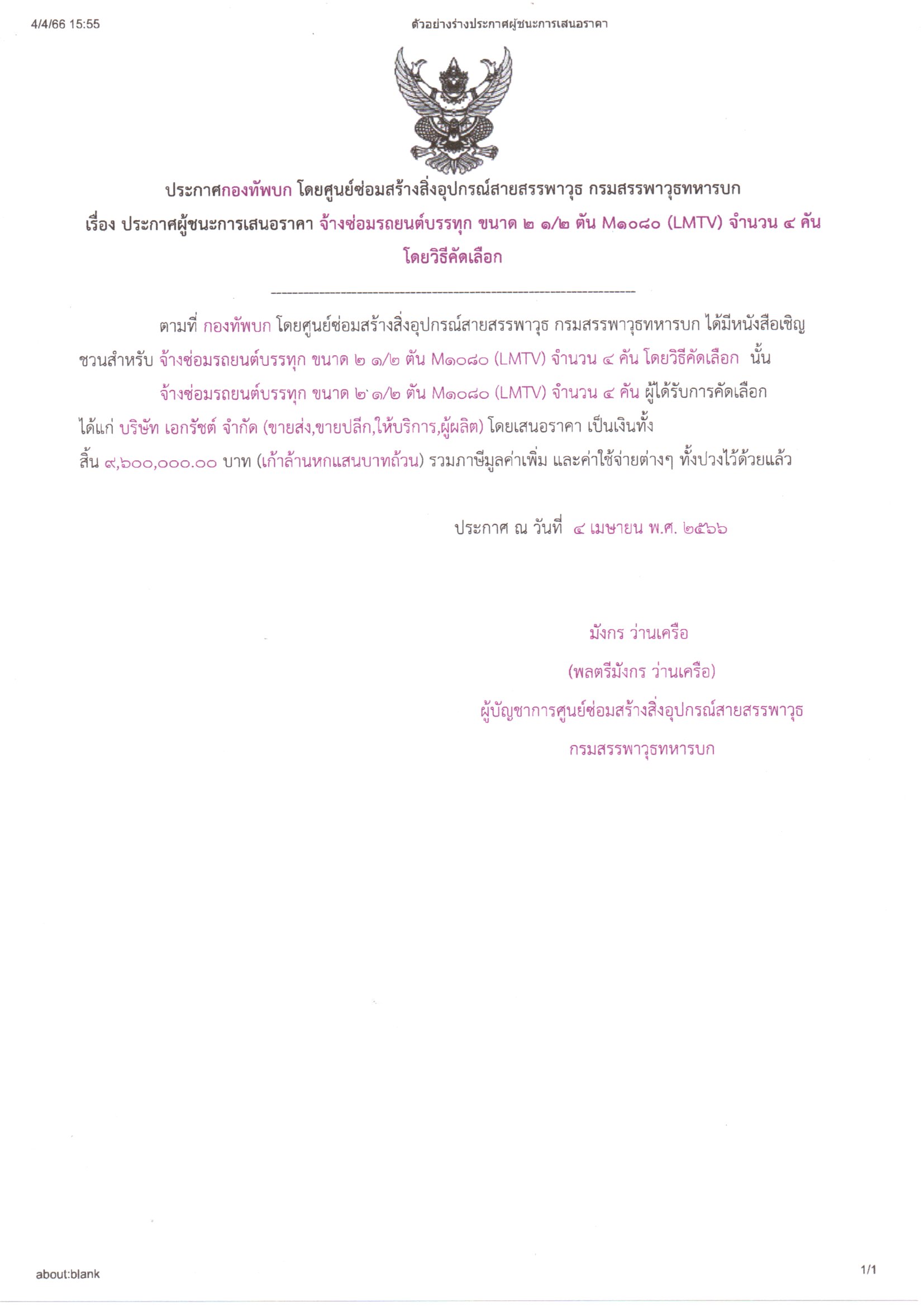 ตามที่กองทัพบก โดยศูนย์ซ่อมสร้างสิ่งอุปกรณ์สายสรรพาวุธ กรมสรรพาวุธทหารบก ได้มีโครงการ จ้างซ่อมรถยนต์บรรทุก ขนาด ๒ ๑/๒ ตัน M1080 (LMTV) จำนวน ๔ คัน โดยวิธีคัดเลือก นั้น