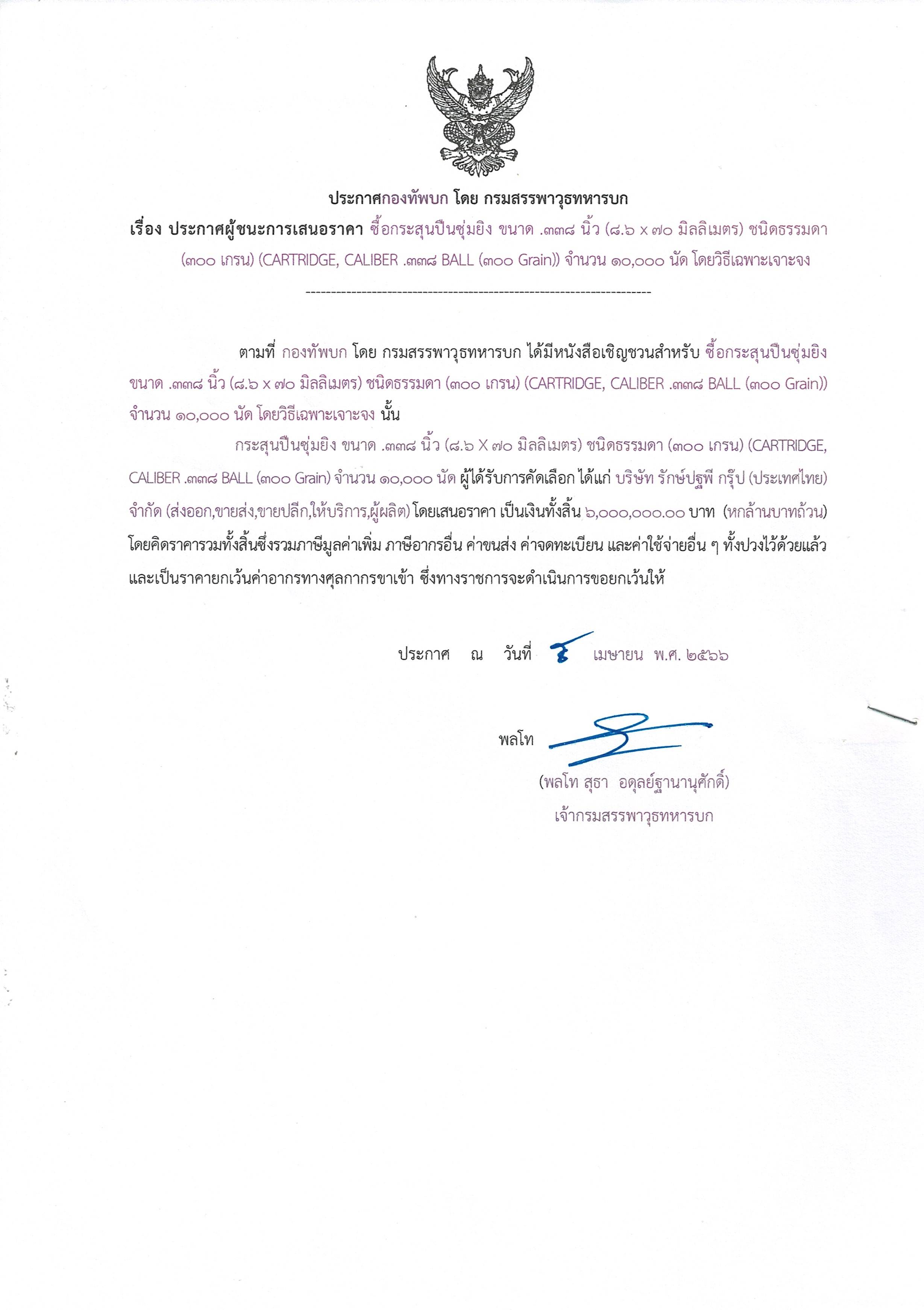 กระสุนปืนซุ่มยิง ขนาด .๓๓๘ นิ้ว (๘.๖ X ๗๐ มิลลิเมตร) ชนิดธรรมดา (๓๐๐ เกรน) (CARTRIDGE, CALIBER .๓๓๘ BALL (๓๐๐ Grain) จำนวน ๑๐,๐๐๐ นัด ผู้ได้รับการคัดเลือก ได้แก่ บริษัท รักษ์ปฐพี กรุ๊ป (ประเทศไทย) จำกัด (ส่งออก,ขายส่ง,ขายปลีก,ให้บริการ,ผู้ผลิต) โดยเสนอราคา เป็นเงินทั้งสิ้น ๖,๐๐๐,๐๐๐.๐๐ บาท (หกล้านบาทถ้วน) โดยคิดราคารวมทั้งสิ้นซึ่งรวมภาษีมูลค่าเพิ่ม ภาษีอากรอื่น ค่าขนส่ง ค่าจดทะเบียน และค่าใช้จ่ายอื่น ๆ ทั้งปวงไว้ด้วยแล้ว และเป็นราคายกเว้นค่าอากรทางศุลกากรขาเข้าซึ่งทางราชการจะดำเนินการขอยกเว้นให้