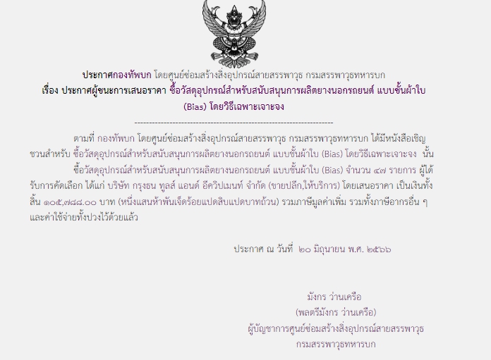 ตามที่ กองทัพบก โดยศูนย์ซ่อมสร้างสิ่งอุปกรณ์สายสรรพาวุธ กรมสรรพาวุธทหารบก ได้มีโครงการซื้อวัสดุอุปกรณ์สำหรับสนับสนุนการผลิตยางนอกรถยนต์ แบบชั้นผ้าใบ (Bias) จำนวน ๔๗ รายการ โดยวิธีเฉพาะเจาะจง นั้น
