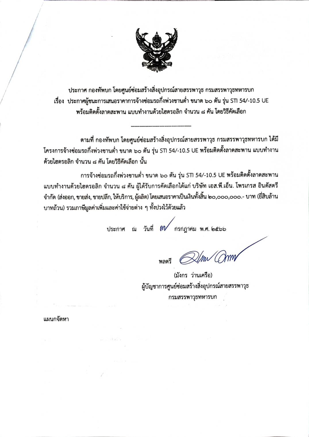 ตามที่ กองทัพบก โดยศูนย์ซ่อมสร้างสิ่งอุปกรณ์สายสรรพาวุธ กรมสรรพาวุธทหารบก ได้มีหนังสือเชิญชวนสำหรับ จ้างซ่อม รถกึ่งพ่วงชานต่ำ ขนาด ๖๐ ตัน รุ่น STI ๕๔-๑๐.๕ UE พร้อมติดตั้งลาดสะพาน แบบทำงานด้วยไฮดรอลิก จำนวน ๘ คัน โดยวิธีคัดเลือก นั้น