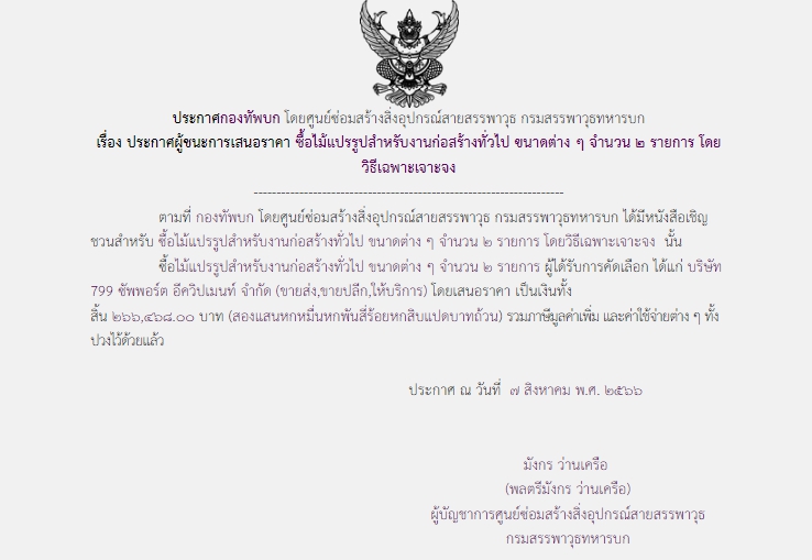 ซื้อไม้แปรรูปสำหรับงานก่อสร้างทั่วไป ขนาดต่าง ๆ จำนวน ๒ รายการ สนับสนุนงานซ่อมสร้างรถพ่วงบรรทุกสัมภาระ ขนาด ๑ ๑/๒ ตัน เอ็ม ๑๐๕ ผู้ได้รับการคัดเลือกได้แก่บริษัท 799 ซัพพอร์ต อีควิปเมนท์ จำกัด (ขายส่ง,ขายปลีก,ให้บริการ) โดยเสนอราคาเป็นเงินทั้งสิ้น ๒๖๖,๔๖๘.- บาท (สองแสนหกหมื่น หกพันสี่ร้อยหกสิบแปดบาทถ้วน) ราคาที่เสนอเป็นราคารวมภาษีมูลค่าเพิ่ม และค่าใช้จ่ายต่าง ๆ ทั้งปวงไว้ด้วยแล้ว