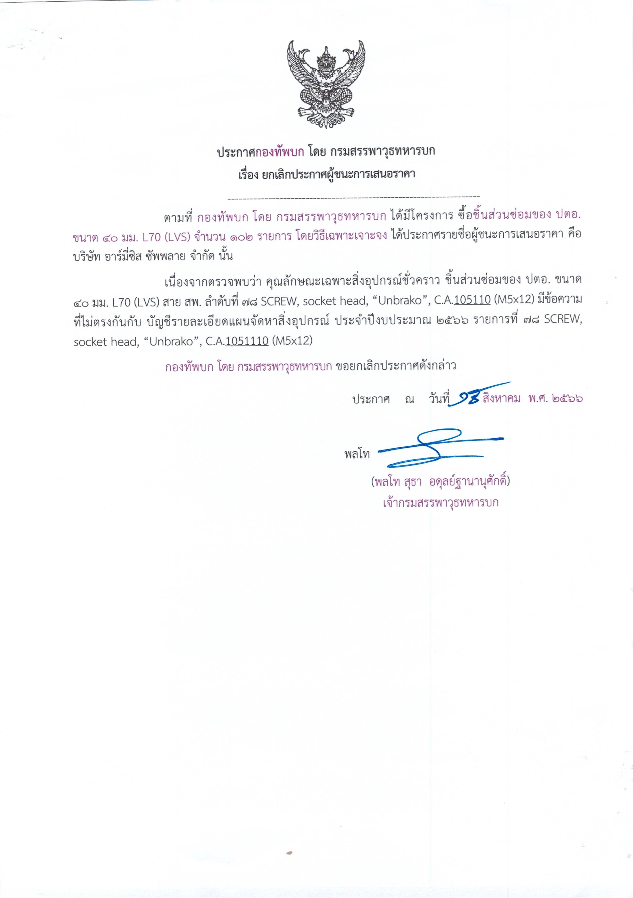 เรื่อง ยกเลิกประกาศผู้ชนะการเสนอราคา เรื่อง ซื้อชิ้นส่วนซ่อมของ ปตอ. ขนาด ๔๐ มม. L70 (LVS) จำนวน ๑๐๒ รายการ โดยวิธีเฉพาะเจาะจง