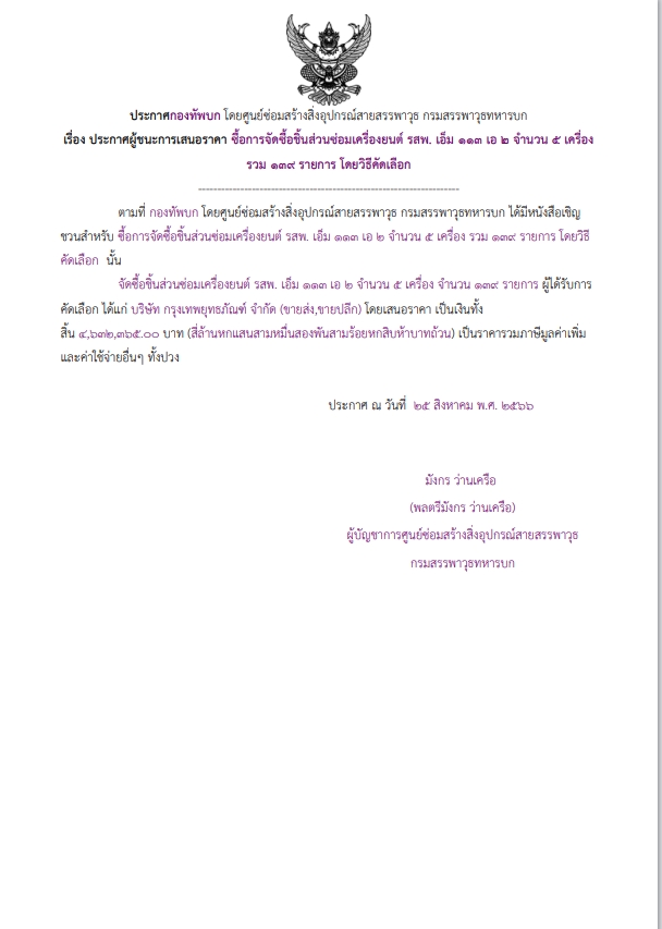 เรื่อง ประกาศผู้ชนะการเสนอราคา การจัดซื้อชิ้นส่วนซ่อมเครื่องยนต์ รสพ. เอ็ม ๑๑๓ เอ ๒ จำนวน ๕ เครื่อง รวม ๑๓๙ รายการ โดยวิธีคัดเลือก