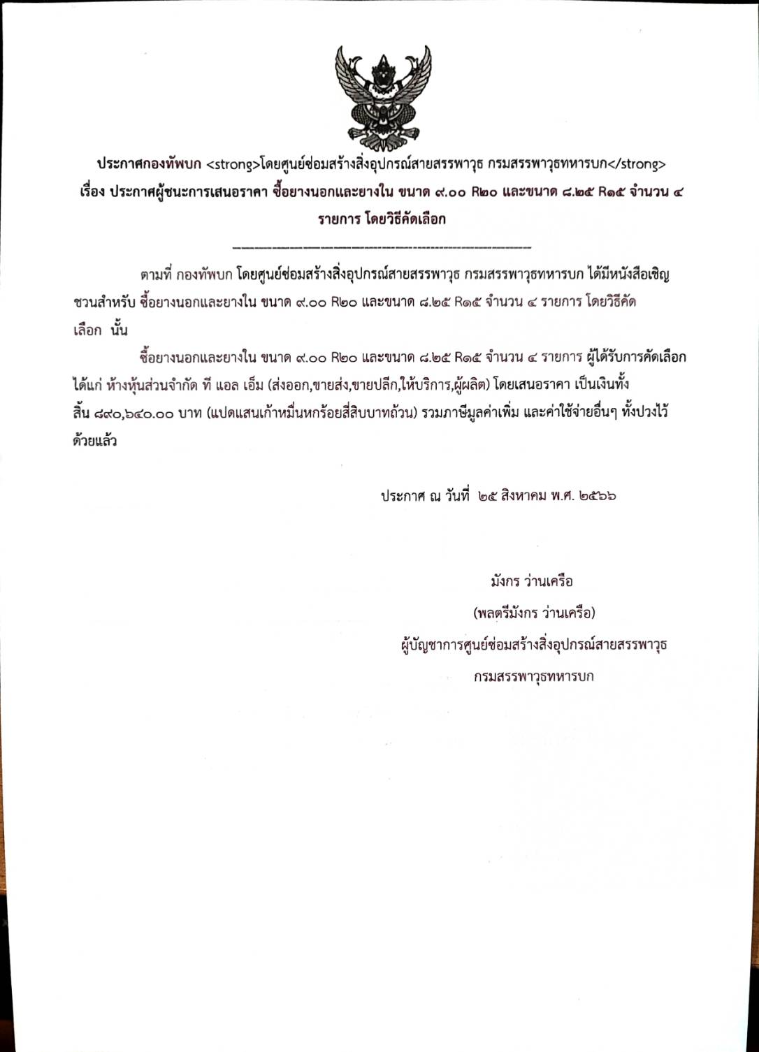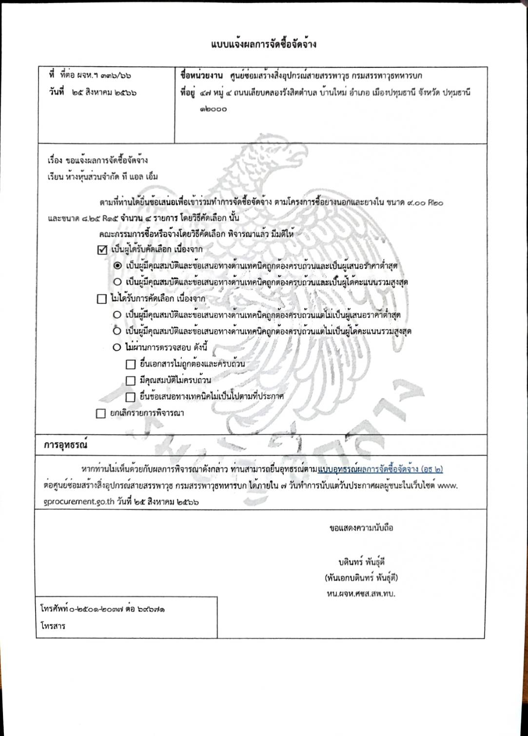 ตามที่ กองทัพบก โดยศูนย์ซ่อมสร้างสิ่งอุปกรณ์สายสรรพาวุธ กรมสรรพาวุธทหารบก ได้มีหนังสือเชิญชวนสำหรับ ซื้อยางนอกและยางใน ขนาด ๙.๐๐ R๒๐ และขนาด ๘.๒๕ R๑๕ จำนวน ๔ รายการ โดยวิธีคัดเลือก นั้น