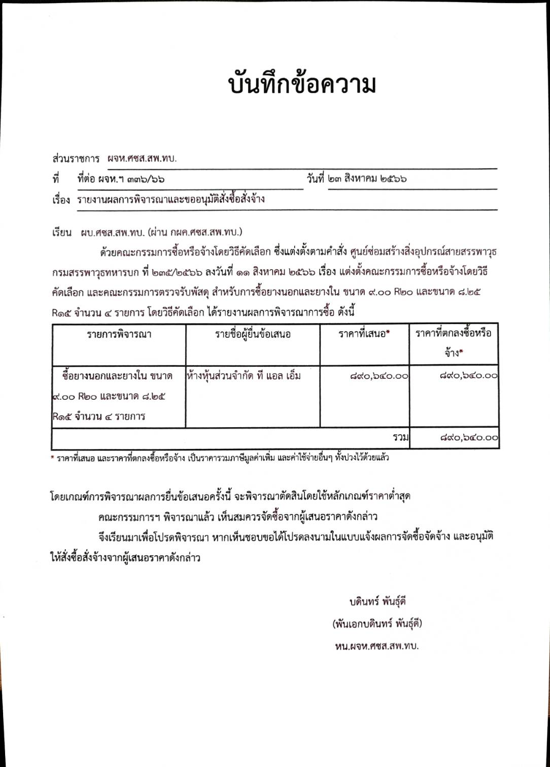 ซื้อยางนอกและยางใน ขนาด ๙.๐๐ R๒๐ และขนาด ๘.๒๕ R๑๕ จำนวน ๔ รายการ ผู้ได้รับการคัดเลือก ได้แก่ ห้างหุ้นส่วนจำกัด ที แอล เอ็ม (ส่งออก,ขายส่ง,ขายปลีก,ให้บริการ,ผู้ผลิต) โดยเสนอราคา เป็นเงินทั้งสิ้น ๘๙๐,๖๔๐.๐๐ บาท (แปดแสนเก้าหมื่นหกร้อยสี่สิบบาทถ้วน) รวมภาษีมูลค่าเพิ่ม และค่าใช้จ่ายอื่นๆ ทั้งปวงไว้ด้วยแล้ว