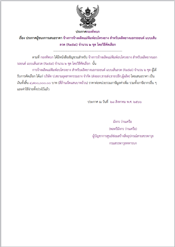 เรื่อง ประกาศผู้ชนะการเสนอราคา การจ้างผลิตแม่พิมพ์อบโครงยาง สำหรับผลิตยางนอกรถยนต์ แบบเส้นลวด (Radial) จำนวน ๒ ชุด โดยวิธีคัดเลือก