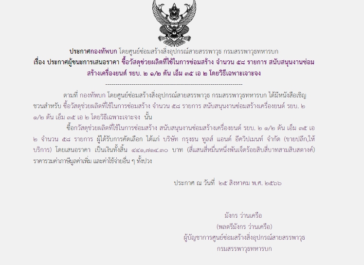 เรื่อง ประกาศผู้ชนะการเสนอราคาซื้อวัสดุช่วยผลิตที่ใช้ในการซ่อมสร้าง จำนวน ๕๘ รายการ สนับสนุนงานซ่อมสร้างเครื่องยนต์ รยบ. ๒ ๑/๒ ตัน เอ็ม ๓๕ เอ ๒ โดยวิธีเฉพาะเจาะจง