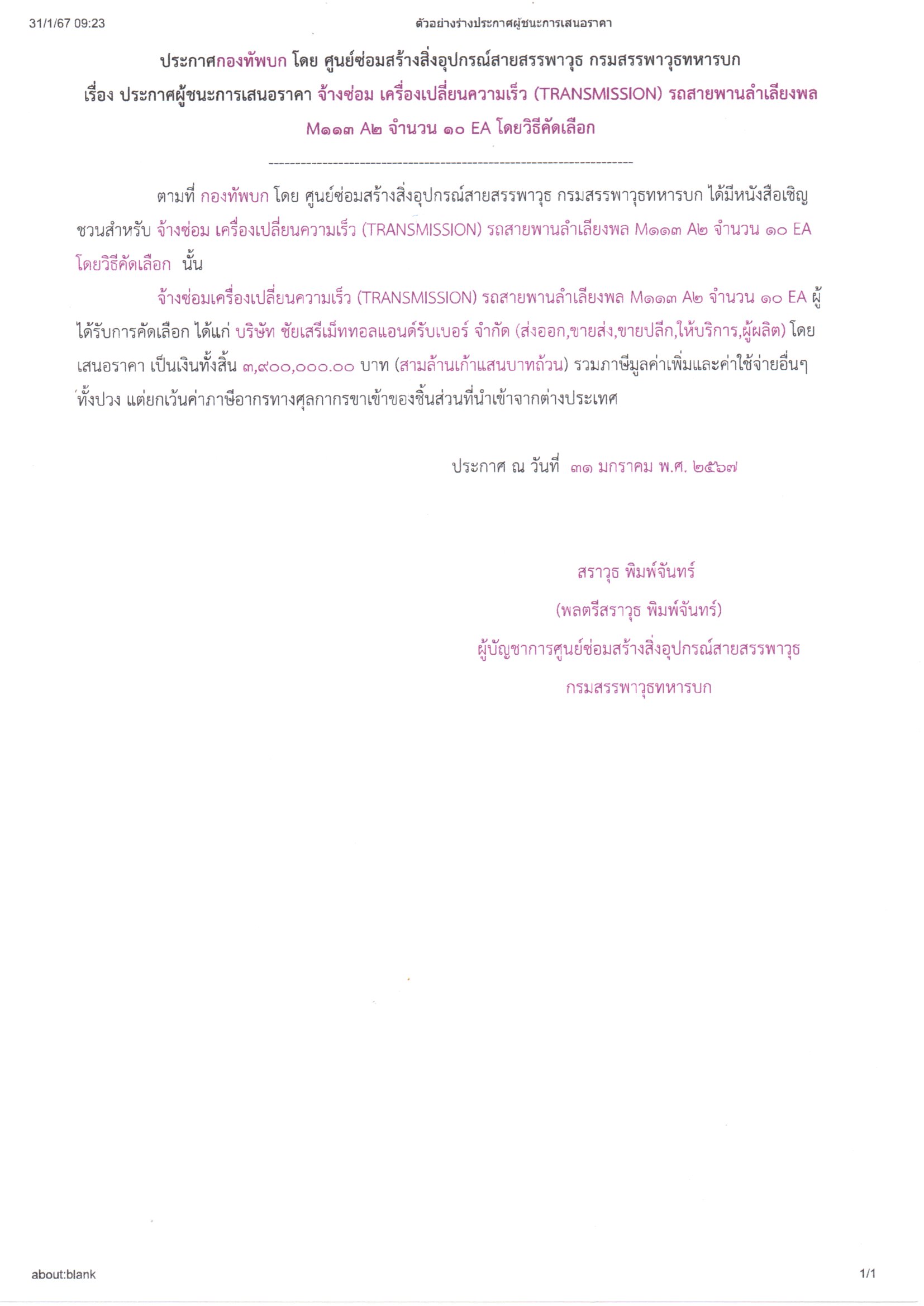 การจ้างซ่อมเครื่องเปลี่ยนความเร็ว (TRANSMISSION) รถสายพานลำเลียงพล M113 A2 จำนวน 10 EA ผู้ได้รับการคัดเลือก ได้แก่บริษัท ชัยเสรีเม็ททอลแอนด์รับเบอร์ จำกัด (ส่งออก, ขายส่ง, ขายปลีก, ให้บริการ, ผู้ผลิต) โดยเสนอราคาเป็นเงินทั้งสิ้น ๓,๙๐๐,๐๐๐.- บาท (สามล้านเก้าแสนบาทถ้วน) รวมภาษีมูลค่าเพิ่มและค่าใช้จ่ายอื่นๆ ทั้งปวงไว้ แต่ยกเว้นค่าภาษีอากรทางศุลกากรขาเข้าของชิ้นส่วนที่นำเข้าจากต่างประเทศ