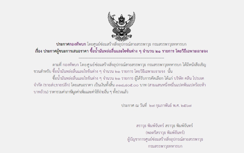ตามที่ กองทัพบก โดยศูนย์ซ่อมสร้างสิ่งอุปกรณ์สายสรรพาวุธ กรมสรรพาวุธทหารบก ได้มีโครงการซื้อน้ำมันหล่อลื่นและไขข้นต่าง ๆ จำนวน ๒๑ รายการ โดยวิธีเฉพาะเจาะจง นั้น