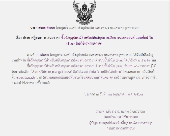 ตามที่ กองทัพบก โดยศูนย์ซ่อมสร้างสิ่งอุปกรณ์สายสรรพาวุธ กรมสรรพาวุธทหารบก ได้มีโครงการซื้อวัสดุอุปกรณ์สำหรับสนับสนุนการผลิตยางนอกรถยนต์ แบบชั้นผ้าใบ (Bias) จำนวน ๔๖ รายการ โดยวิธีเฉพาะเจาะจง นั้น