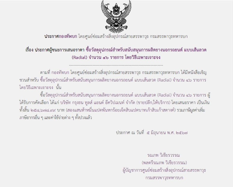 ตามที่ กองทัพบก โดยศูนย์ซ่อมสร้างสิ่งอุปกรณ์สายสรรพาวุธ กรมสรรพาวุธทหารบก ได้มีโครงการซื้อวัสดุอุปกรณ์สำหรับสนับสนุนการผลิตยางนอกรถยนต์ แบบเส้นลวด (Radial) จำนวน ๔๖ รายการ โดยวิธีเฉพาะเจาะจง นั้น