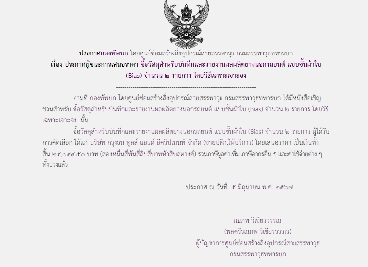ตามที่ กองทัพบก โดยศูนย์ซ่อมสร้างสิ่งอุปกรณ์สายสรรพาวุธ กรมสรรพาวุธทหารบก ได้มีโครงการซื้อวัสดุสำหรับบันทึกและรายงานผลผลิตยางนอกรถยนต์ แบบชั้นผ้าใบ (Bias) จำนวน ๒ รายการ โดยวิธีเฉพาะเจาะจง นั้น