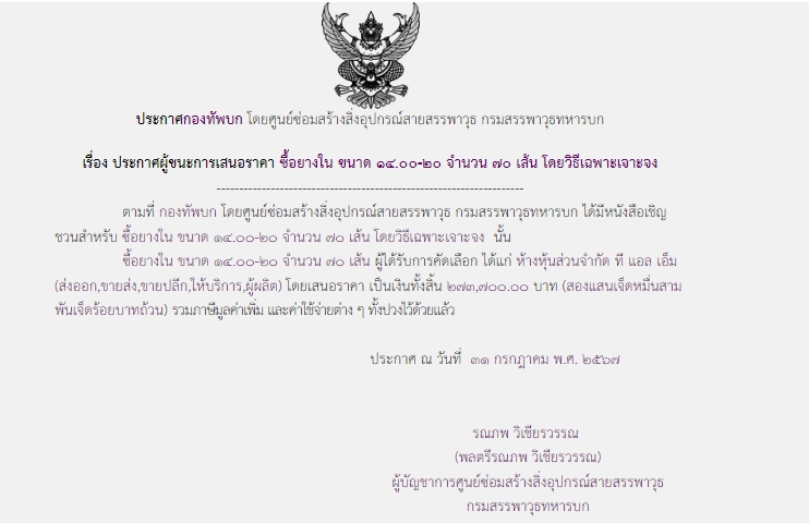 ตามที่ กองทัพบก โดยศูนย์ซ่อมสร้างสิ่งอุปกรณ์สายสรรพาวุธ กรมสรรพาวุธทหารบก ได้มีโครงการซื้อยางใน ขนาด 14.00-20 จำนวน ๗๐ เส้น โดยวิธีเฉพาะเจาะจง นั้น