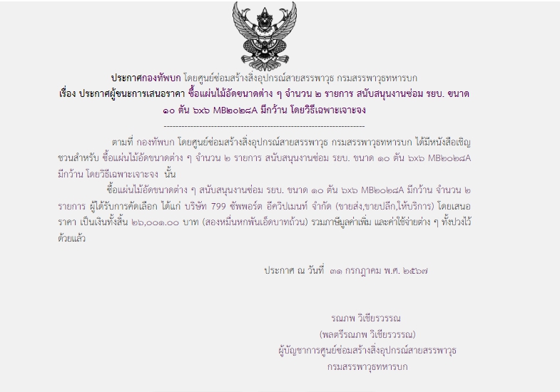 ตามที่ กองทัพบก โดยศูนย์ซ่อมสร้างสิ่งอุปกรณ์สายสรรพาวุธ กรมสรรพาวุธทหารบก ได้มีหนังสือเชิญชวนสำหรับ ซื้อแผ่นไม้อัดขนาดต่าง ๆ จำนวน ๒ รายการ สนับสนุนงานซ่อม รยบ. ขนาด ๑๐ ตัน ๖x๖ MB๒๐๒๘A มีกว้าน โดยวิธีเฉพาะเจาะจง นั้น