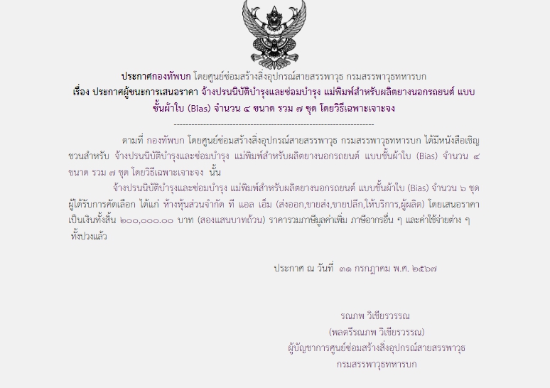 ตามที่ กองทัพบก โดยศูนย์ซ่อมสร้างสิ่งอุปกรณ์สายสรรพาวุธ กรมสรรพาวุธทหารบก ได้มีหนังสือเชิญชวนสำหรับ จ้างปรนนิบัติบำรุงและซ่อมบำรุง แม่พิมพ์สำหรับผลิตยางนอกรถยนต์ แบบชั้นผ้าใบ (Bias) จำนวน ๔ ขนาด รวม ๗ ชุด โดยวิธีเฉพาะเจาะจง นั้น