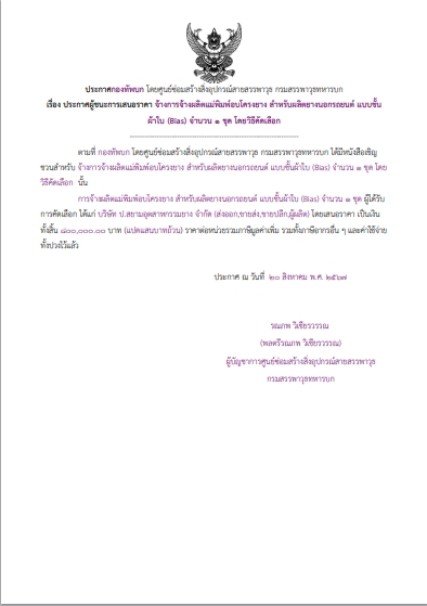 ตามที่ กองทัพบก โดยศูนย์ซ่อมสร้างสิ่งอุปกรณ์สายสรรพาวุธ กรมสรรพาวุธทหารบก ได้มีหนังสือเชิญชวนสำหรับ จ้างการจ้างผลิตแม่พิมพ์อบโครงยาง สำหรับผลิตยางนอกรถยนต์ แบบชั้นผ้าใบ (Bias) จำนวน ๑ ชุด โดยวิธีคัดเลือก นั้น