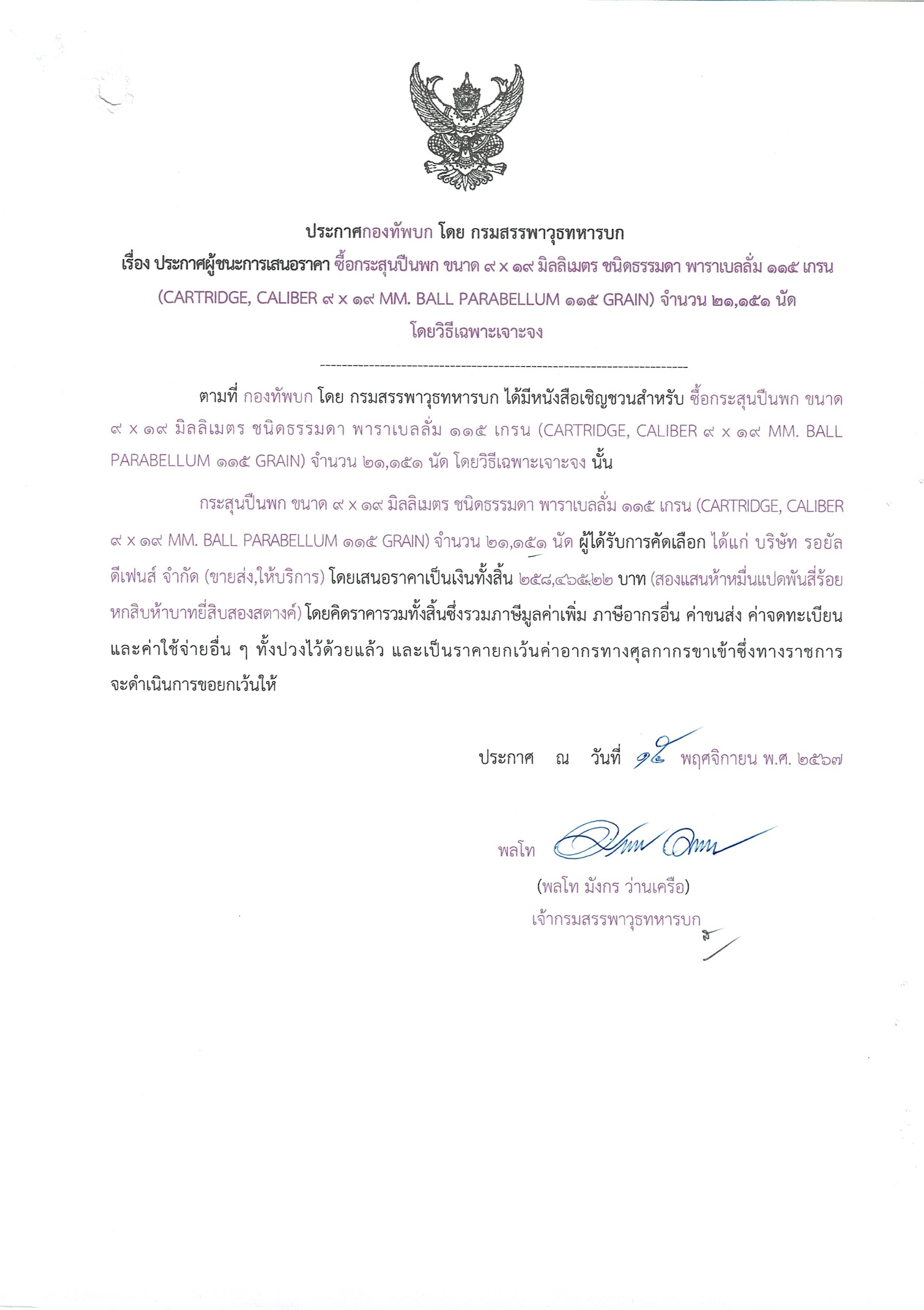 กระสุนปืนพก ขนาด ๙ x ๑๙ มิลลิเมตร ชนิดธรรมดา พาราเบลลั่ม ๑๑๕ เกรน (CARTRIDGE, CALIBER ๙ x ๑๙ MM. BALL PARABELLUM ๑๑๕ GRAIN) จำนวน ๒๑,๑๕๑ นัด ผู้ได้รับการคัดเลือก ได้แก่ บริษัท รอยัล ดีเฟนส์ จำกัด (ขายส่ง,ให้บริการ) โดยเสนอราคา เป็นเงินทั้งสิ้น ๒๕๘,๔๖๕.๒๒ บาท (สองแสนห้าหมื่นแปดพันสี่ร้อยหกสิบห้าบาทยี่สิบสองสตางค์) โดยคิดราคารวมทั้งสิ้นซึ่งรวมภาษีมูลค่าเพิ่ม ภาษีอากรอื่น ค่าขนส่ง ค่าจดทะเบียน และค่าใช้จ่ายอื่น ๆ ทั้งปวงไว้ด้วยแล้ว และเป็นราคายกเว้นค่าอากรทางศุลกากรขาเข้าซึ่งทางราชการจะดำเนินการขอยกเว้นให้