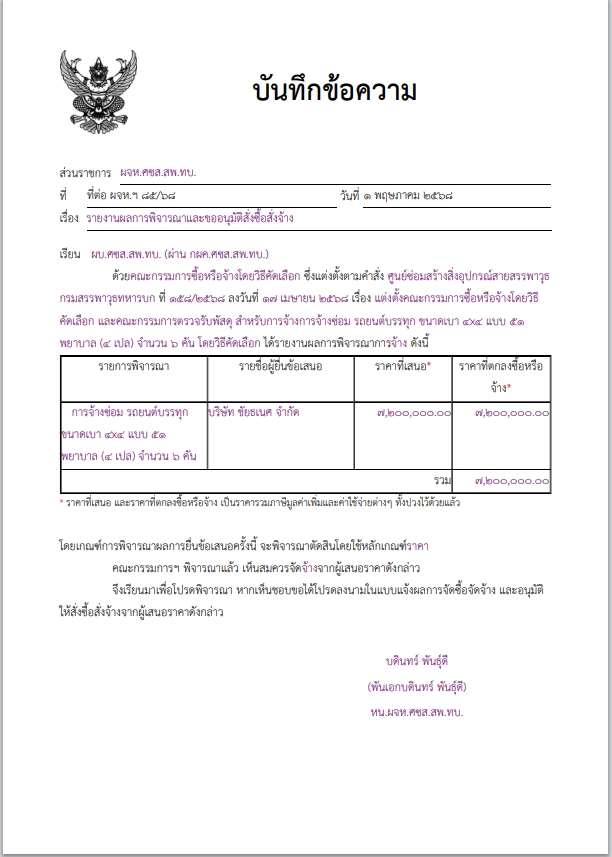 การจ้างซ่อม รถยนต์บรรทุก ขนาดเบา ๔x๔ แบบ ๕๑ พยาบาล (๔ เปล) จำนวน ๖ คัน ผู้ได้รับการคัดเลือก ได้แก่ บริษัท ชัยธเนศ จำกัด (ส่งออก,ขายส่ง,ขายปลีก,ผู้ผลิต) โดยเสนอราคา เป็นเงินทั้งสิ้น ๗,๒๐๐,๐๐๐.๐๐ บาท (เจ็ดล้านสองแสนบาทถ้วน) ราคารวมภาษีมูลค่าเพิ่มและค่าใช้จ่ายต่างๆ ทั้งปวงไว้ด้วยแล้ว