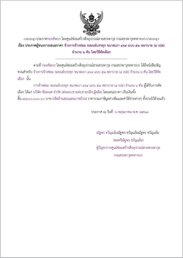 เรื่อง ประกาศผู้ชนะการเสนอราคา การจ้างซ่อม รถยนต์บรรทุก ขนาดเบา ๔x๔ แบบ ๕๑ พยาบาล (๔ เปล) จำนวน ๖ คัน โดยวิธีคัดเลือก