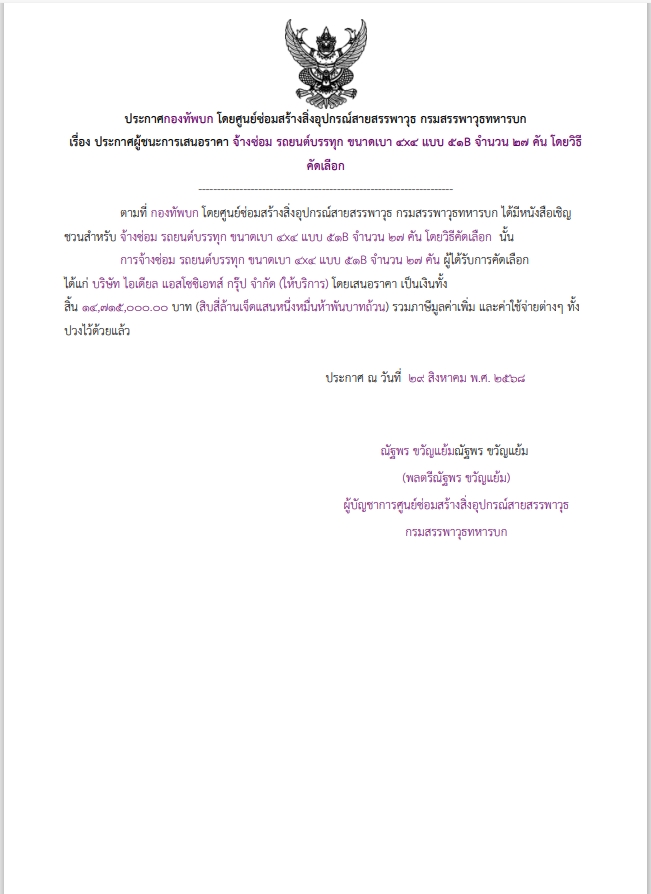 การจ้างซ่อม รถยนต์บรรทุก ขนาดเบา ๔x๔ แบบ ๕๑B จำนวน ๒๗ คัน ผู้ได้รับการคัดเลือก ได้แก่ บริษัท ไอเดียล แอสโซซิเอทส์ กรุ๊ป จำกัด (ให้บริการ) โดยเสนอราคา เป็นเงินทั้งสิ้น ๑๔,๗๑๕,๐๐๐.๐๐ บาท (สิบสี่ล้านเจ็ดแสนหนึ่งหมื่นห้าพันบาทถ้วน) รวมภาษีมูลค่าเพิ่ม และค่าใช้จ่ายต่างๆ ทั้งปวงไว้ด้วยแล้ว