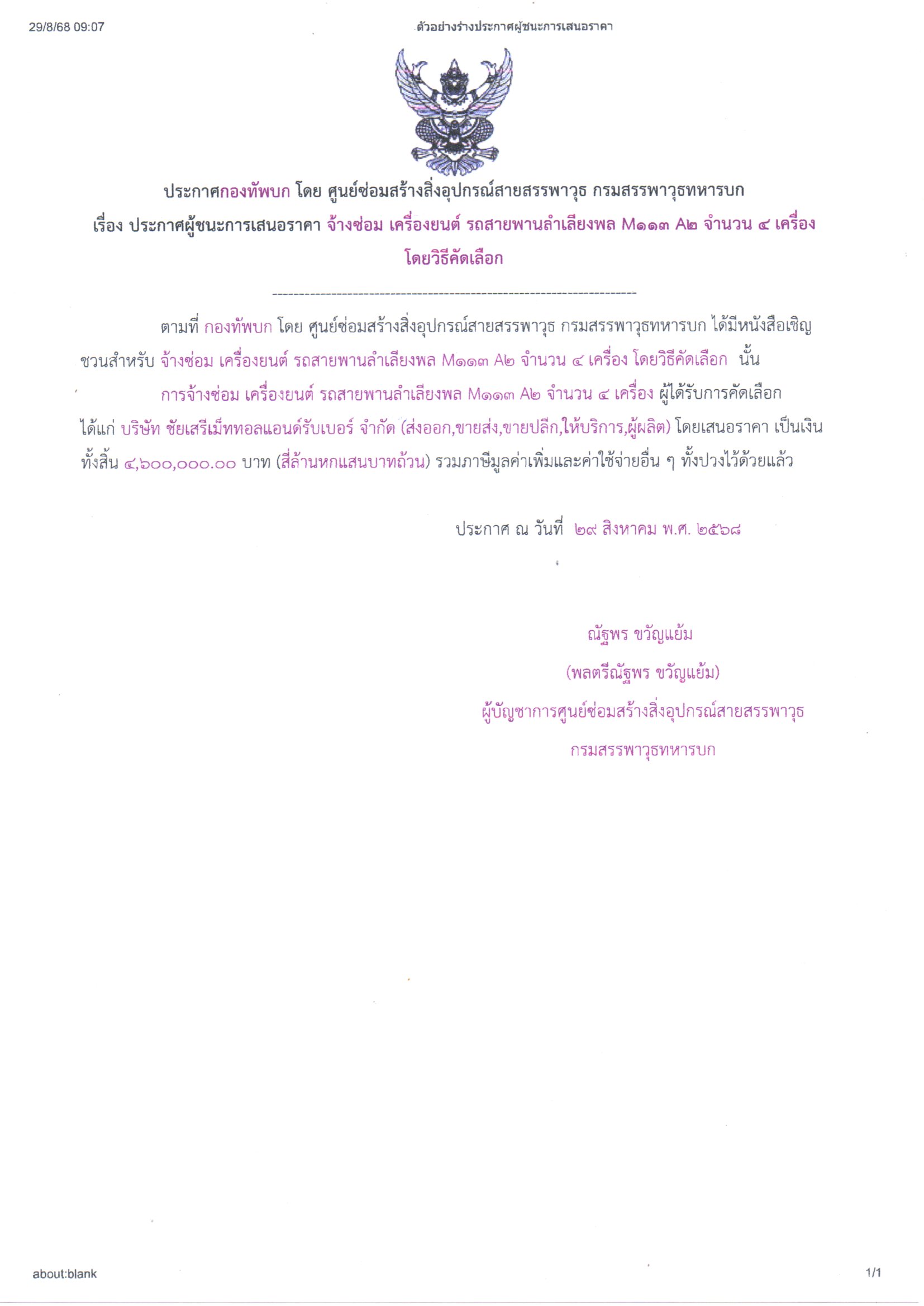 จ้างซ่อม เครื่องยนต์ รถสายพานลำเลียงพล M113 A2 จำนวน ๔ เครื่อง ผู้ได้รับการคัดเลือกได้แก่ บริษัท ชัยเสรีเม็ททอลแอนด์รับเบอร์ จำกัด (ส่งออก,ขายส่ง,ขายปลีก, ให้บริการ,ผู้ผลิต) โดยเสนอราคา เป็นเงินทั้งสิ้น ๔,๖๐๐,๐๐๐.- บาท (สี่ล้านหกแสนบาทถ้วน) รวมภาษีมูลค่าเพิ่มและค่าใช้จ่ายอื่น ๆ ทั้งปวงไว้ด้วยแล้ว