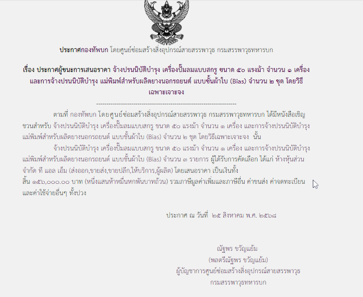 ตามที่ กองทัพบก โดยศูนย์ซ่อมสร้างสิ่งอุปกรณ์สายสรรพาวุธ กรมสรรพาวุธทหารบก ได้มีโครงการจ้างปรนนิบัติบำรุง เครื่องปั๊มลมแบบสกรู ขนาด ๕๐ แรงม้า จำนวน ๑ เครื่อง และการจ้างปรนนิบัติบำรุง แม่พิมพ์สำหรับผลิตยางนอกรถยนต์ แบบชั้นผ้าใบ (Bias) จำนวน ๒ ชุด โดยวิธีเฉพาะเจาะจง นั้น