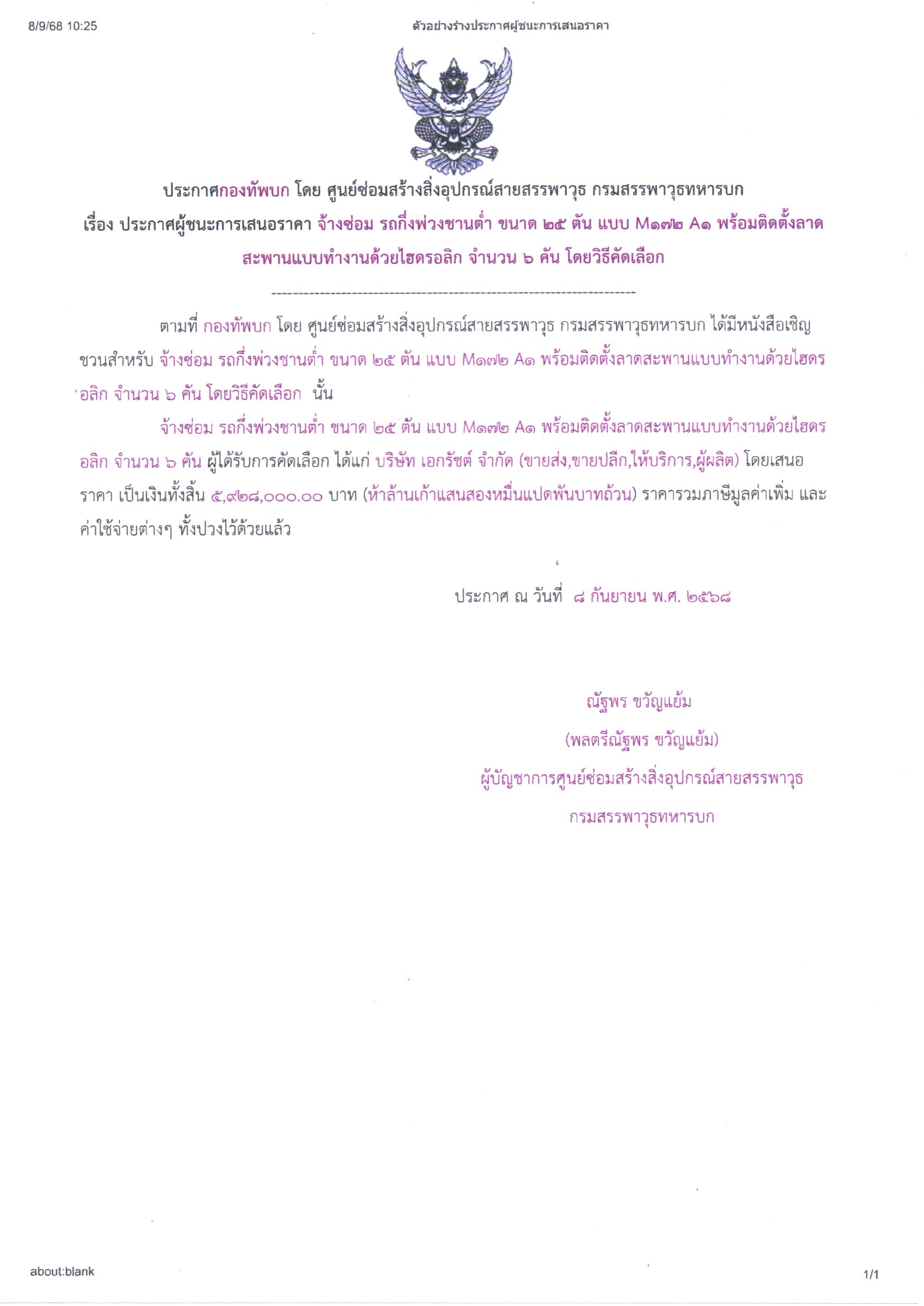 ตามที่กองทัพบก โดยศูนย์ซ่อมสร้างสิ่งอุปกรณ์สายสรรพาวุธ กรมสรรพาวุธทหารบก ได้มีโครงการ การจ้างซ่อม รถกึ่งพ่วงชานต่ำ ขนาด ๒๕ ตัน แบบ M172 A1 พร้อมติดตั้งลาดสะพานแบบทำงานด้วย ไฮดรอลิก จำนวน ๖ คัน โดยวิธีคัดเลือก นั้น