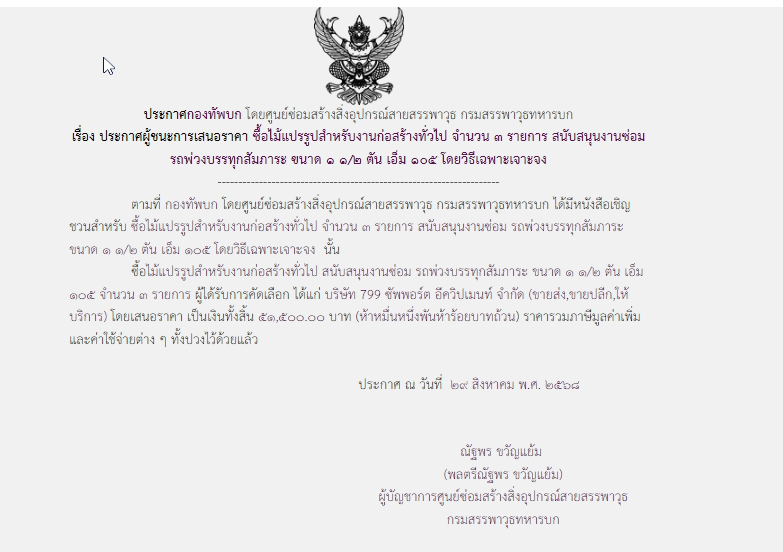 เรื่อง ประกาศผู้ชนะการเสนอราคาซื้อไม้แปรรูปสำหรับงานก่อสร้างทั่วไป จำนวน ๓ รายการ สนับสนุนงานซ่อมรถพ่วงบรรทุกสัมภาระ ขนาด ๑ ๑/๒ ตัน เอ็ม ๑๐๕ โดยวิธีเฉพาะเจาะจง