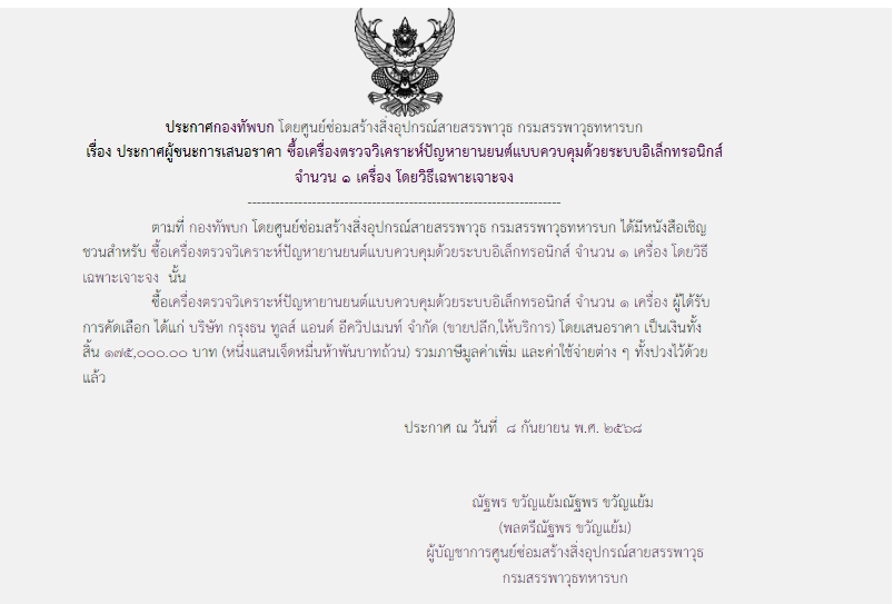 ตามที่ กองทัพบก โดยศูนย์ซ่อมสร้างสิ่งอุปกรณ์สายสรรพาวุธ กรมสรรพาวุธทหารบก ได้มีโครงการซื้อเครื่องตรวจวิเคราะห์ปัญหายานยนต์แบบควบคุมด้วยระบบอิเล็กทรอนิกส์ จำนวน ๑ เครื่อง โดยวิธีเฉพาะเจาะจง นั้น