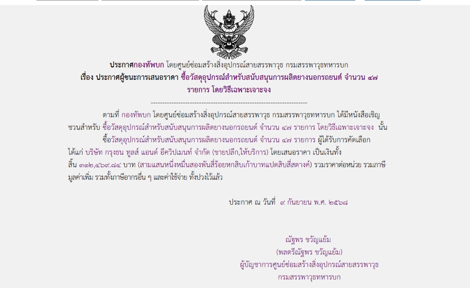 ตามที่ กองทัพบก โดยศูนย์ซ่อมสร้างสิ่งอุปกรณ์สายสรรพาวุธ กรมสรรพาวุธทหารบก ได้มีโครงการซื้อวัสดุอุปกรณ์สำหรับสนับสนุนการผลิตยางนอกรถยนต์ จำนวน ๔๗ รายการ โดยวิธีเฉพาะเจาะจง นั้น