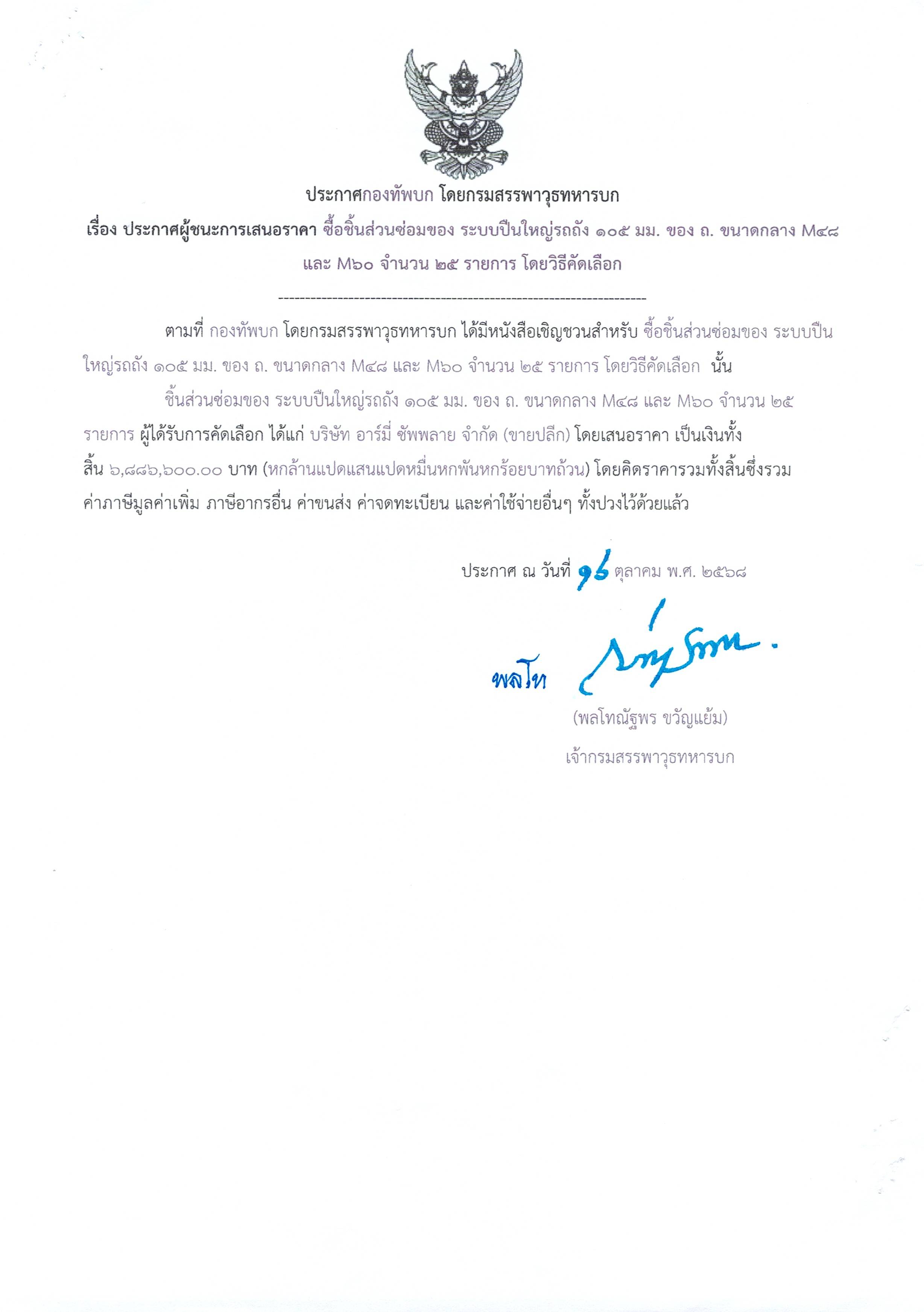 ชิ้นส่วนซ่อมของ ระบบปืนใหญ่รถถัง ๑๐๕ มม. ของ ถ. ขนาดกลาง M๔๘ และ M๖๐ จำนวน ๒๕ รายการ ผู้ได้รับการคัดเลือก ได้แก่ บริษัท อาร์มี่ ซัพพลาย จำกัด (ขายปลีก) โดยเสนอราคา เป็นเงินทั้งสิ้น ๖,๘๘๖,๖๐๐.๐๐ บาท (หกล้านแปดแสนแปดหมื่นหกพันหกร้อยบาทถ้วน) โดยคิดราคารวมทั้งสิ้นซึ่งรวม ค่าภาษีมูลค่าเพิ่ม ภาษีอากรอื่น ค่าขนส่ง ค่าจดทะเบียน และค่าใช้จ่ายอื่นๆ ทั้งปวงไว้ด้วยแล้ว