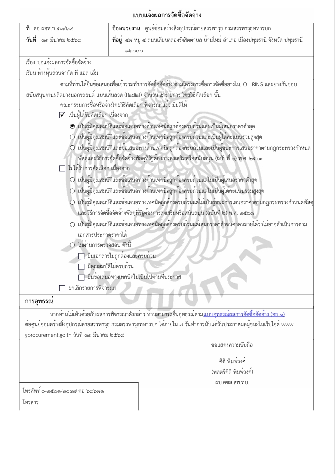ตามที่ กองทัพบก โดยศูนย์ซ่อมสร้างสิ่งอุปกรณ์สายสรรพาวุธ กรมสรรพาวุธทหารบก ได้มีหนังสือเชิญชวนสำหรับ ซื้อการจัดซื้อยางใน, O RING และยางกันขอบ สนับสนุนงานผลิตยางนอกรถยนต์ แบบเส้นลวด (Radial) จำนวน ๕ รายการ โดยวิธีคัดเลือก นั้น