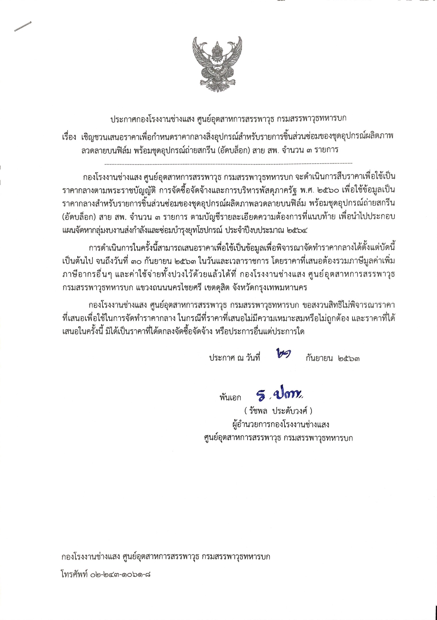 เรื่อง ขอเชิญชวนเสนอราคาเพื่อกำหนดราคากลางสิ่งอุปกรณ์สำหรับรายการชิ้นส่วนซ่อมของชุดอุปกรณ์ผลิตภาพลวดลายบนฟิล์มพร้อมชุดอุปกรณ์ถ่ายสกรีน (อัดบล็อก) สาย สพ. จำนวน ๓ รายการ