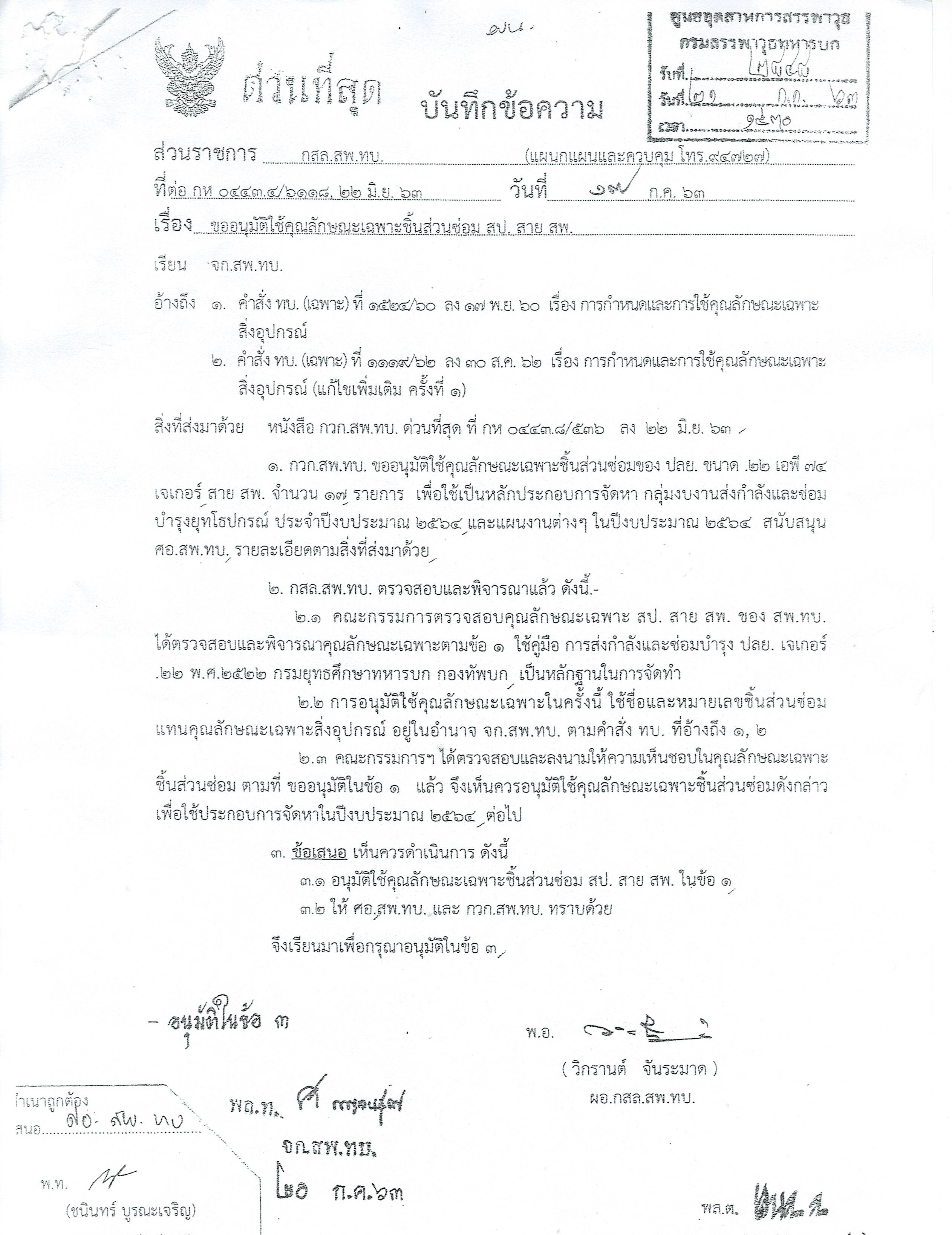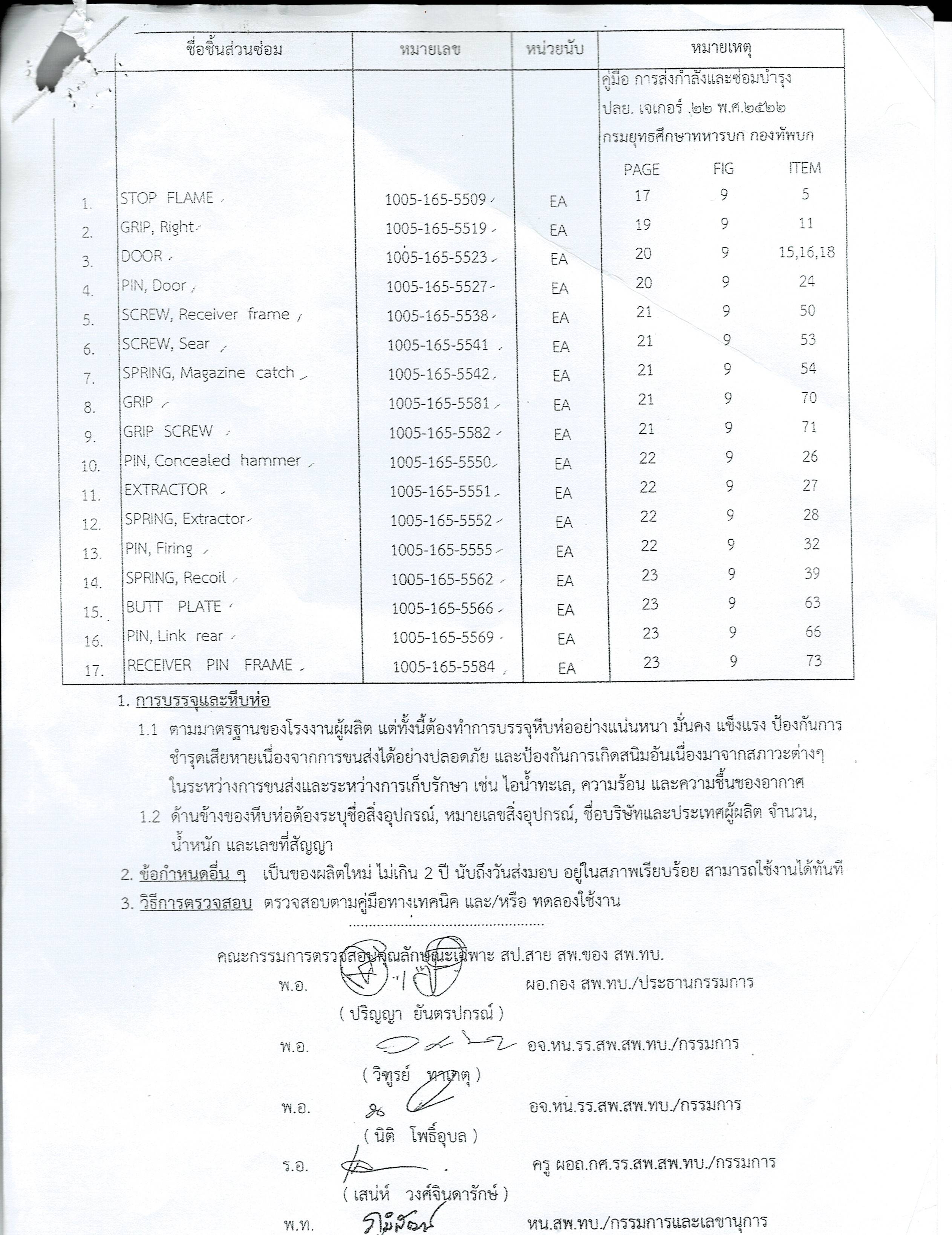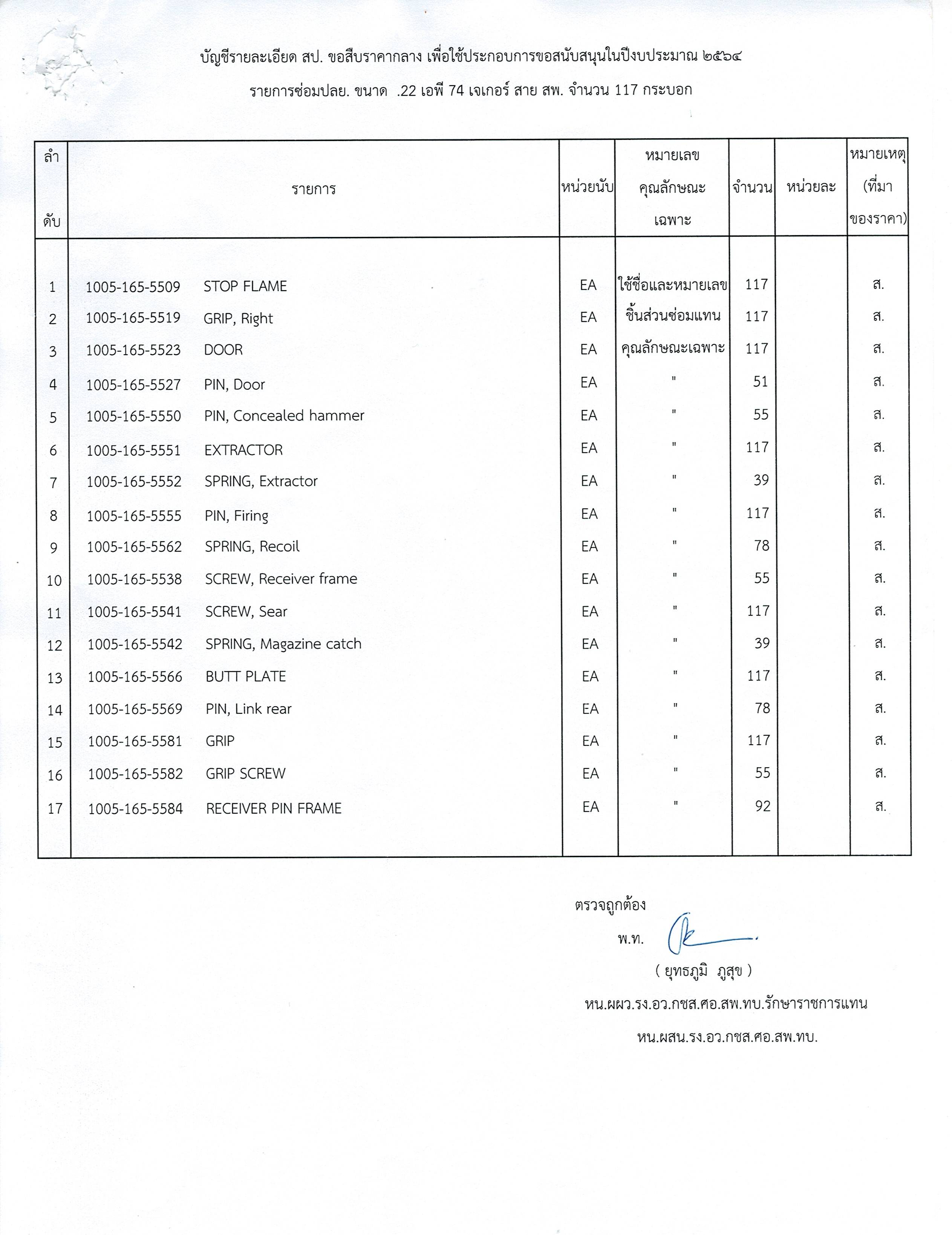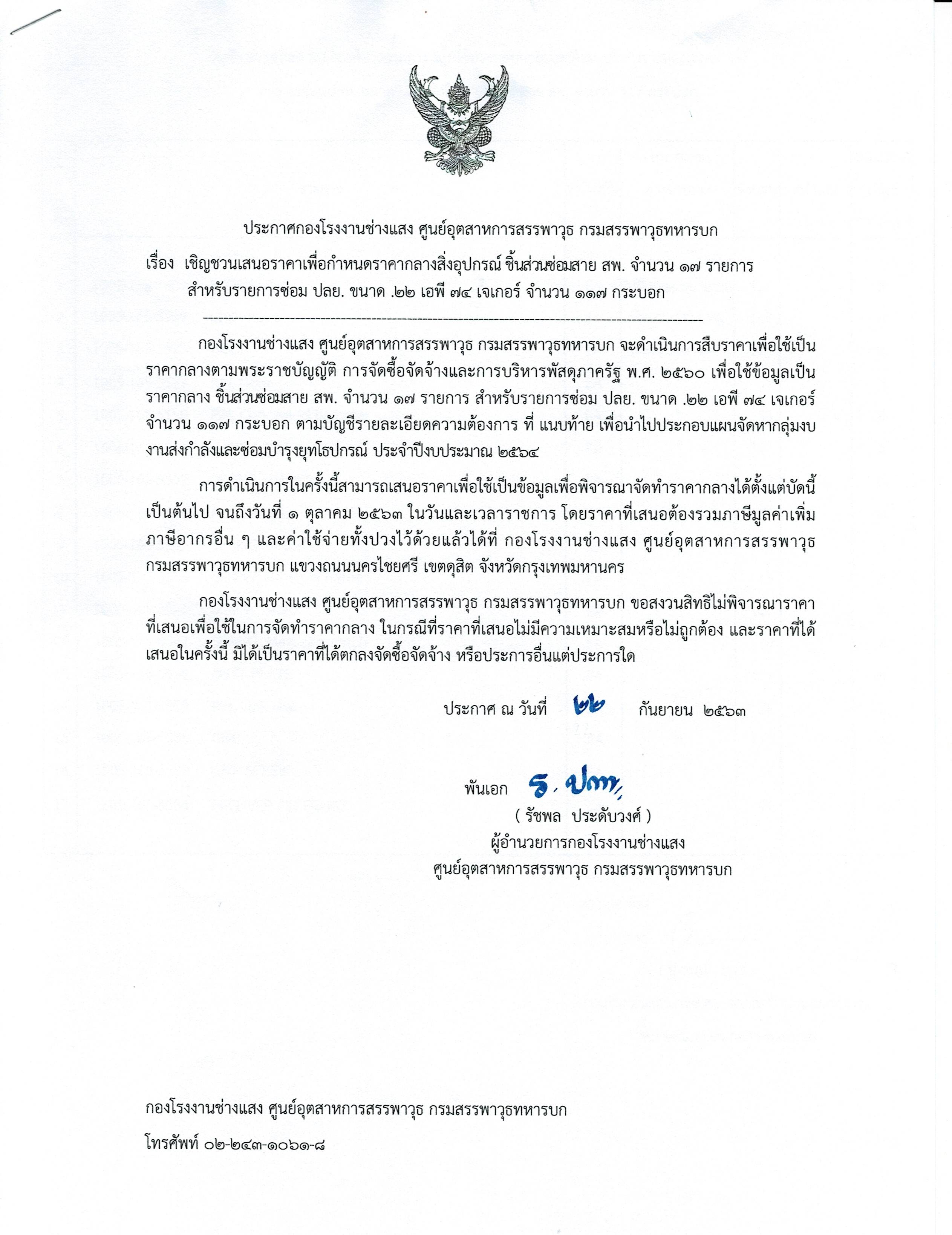 เรื่อง เชิญชวนเสนอราคาเพื่อกำหนดราคากลางสิ่งอุปกรณ์ ชิ้นส่วนซ่อมสาย สพ. จำนวน ๑๗ รายการ สำหรับรายการซ่อม ปลย. ขนาด .๒๒ เอพี ๗๔ เจเกอร์ จำนวน ๑๑๗ กระบอก