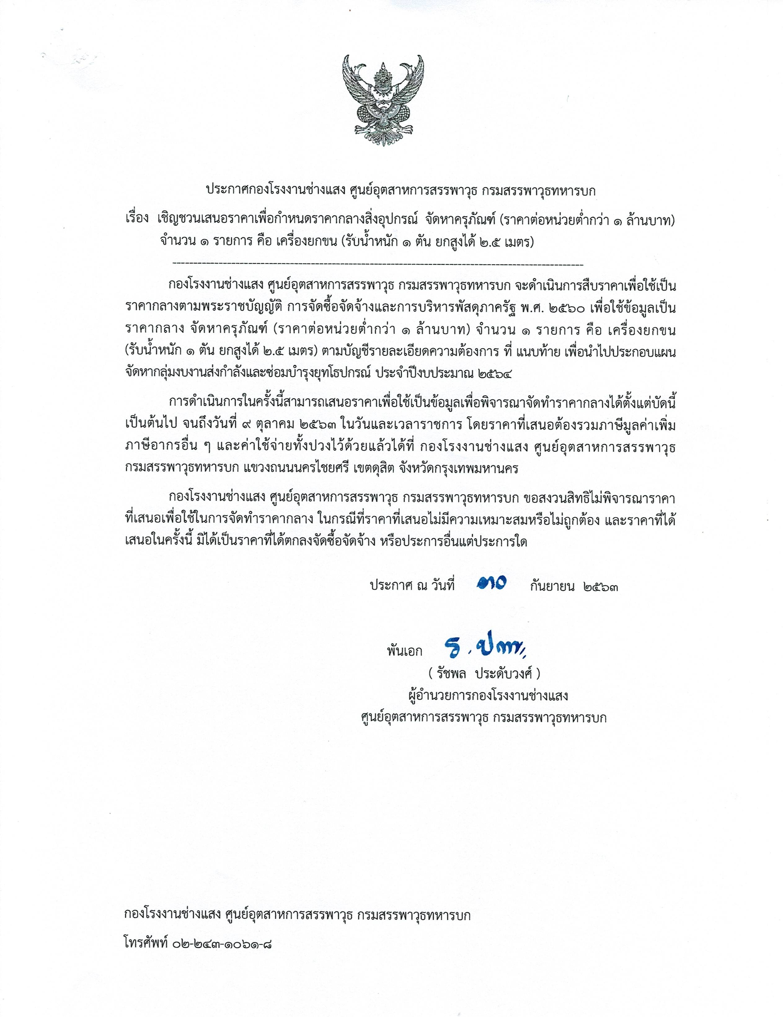 กองโรงงานช่างแสง ศูนย์อุตสาหการสรรพาวุธ กรมสรรพาวุธทหารบก จะดำเนินการสืบราคาเพื่อใช้เป็นราคากลางตามพระราชบัญญัติ การจัดซื้อจัดจ้างและการบริหารพัสดุภาครัฐ พ.ศ. ๒๕๖๐ เพื่อใช้ข้อมูลเป็นราคากลาง จัดหาครุภัณฑ์ (ราคาต่อหน่วยต่ำกว่า ๑ ล้านบาท) จำนวน ๑ รายการ คือ เครื่องยกขน (รับน้ำหนัก ๑ ตัน ยกสูงได้ ๒.๕ เมตร) ตามบัญชีรายละเอียดความต้องการ ที่ แนบท้าย เพื่อนำไปประกอบแผนจัดหากลุ่มงบงานส่งกำลังและซ่อมบำรุงยุทโธปกรณ์ ประจำปีงบประมาณ ๒๕๖๔