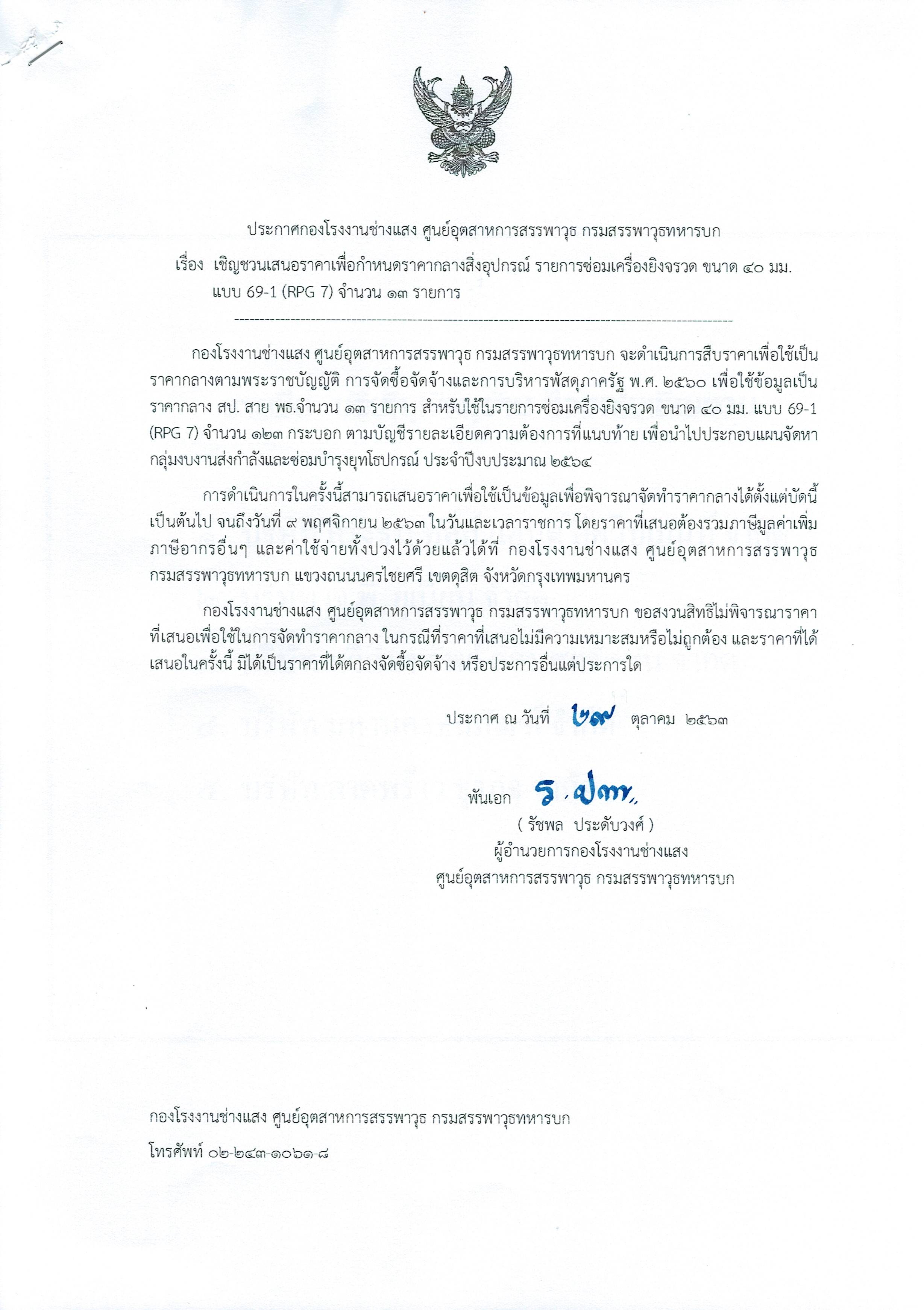 เรื่อง เชิญชวนเสนอราคาเพื่อกำหนดราคากลางสิ่งอุปกรณ์ รายการซ่อมเครื่องยิงจรวด ขนาด ๔๐ มม. แบบ 69-1 (RPG 7) จำนวน ๒ รายการ