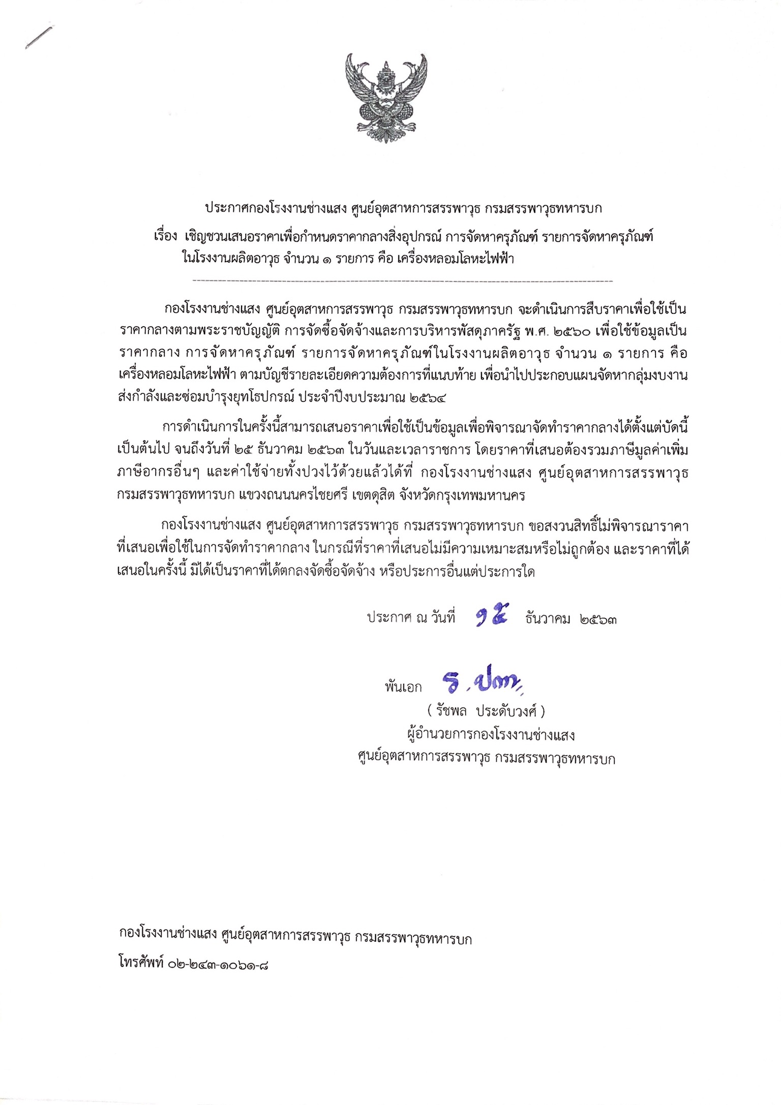 เรื่อง เชิญชวนเสนอราคาเพื่อกำหนดราคากลางสิ่งอุปกรณ์ การจัดหาครุภัณฑ์ รายการจัดหาครุภัณฑ์ในโรงงานผลิตอาวุธ จำนวน ๑ รายการ คือ เครื่องหลอมโลหะไฟฟ้า