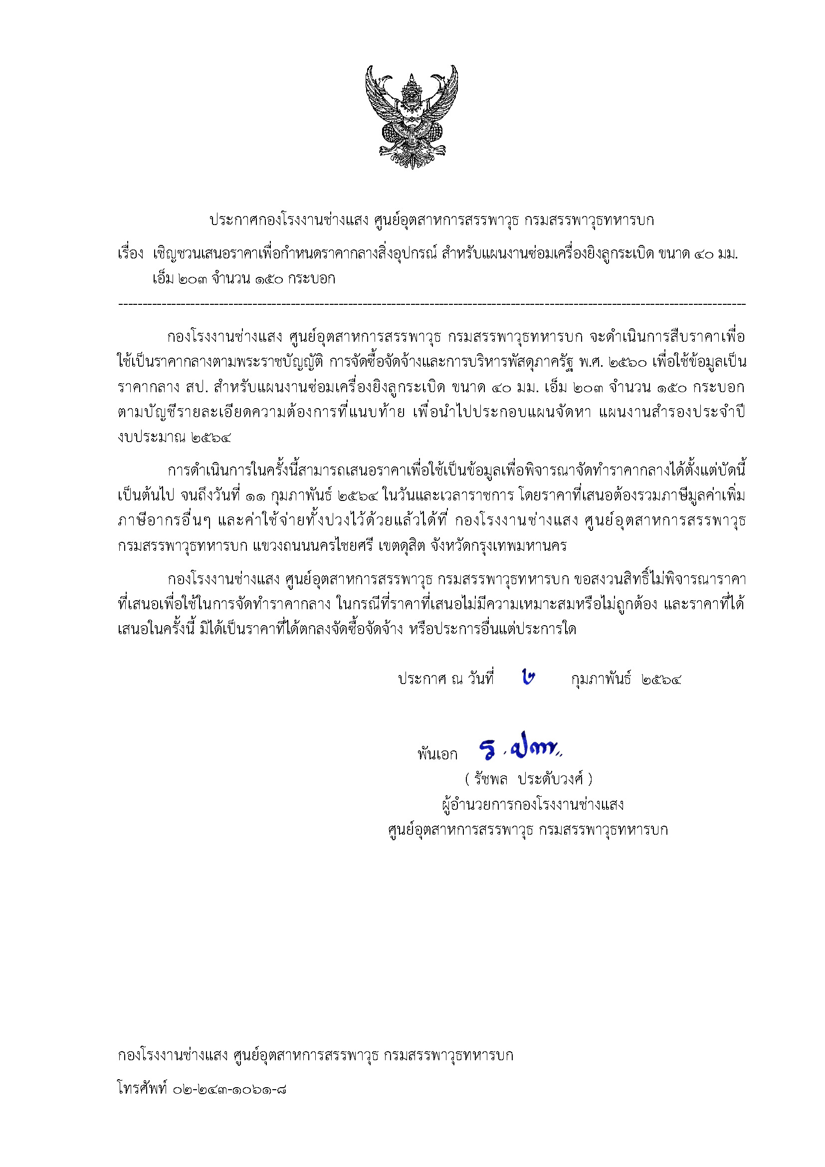 เรื่อง เชิญชวนเสนอราคาเพื่อกำหนดราคากลางสิ่งอุปกรณ์ จำนวน ๔๒ รายการ สำหรับใช้ในรายการซ่อมเครื่องยิงลูกระเบิด ขนาด ๔๐ มม. เอ็ม ๒๐๓ จำนวน ๑๕๐ กระบอก